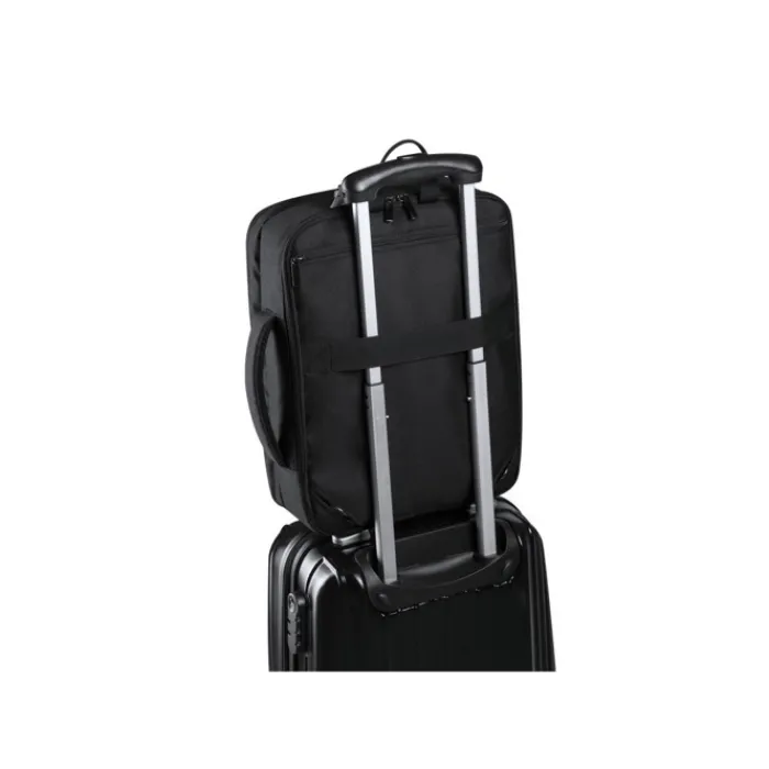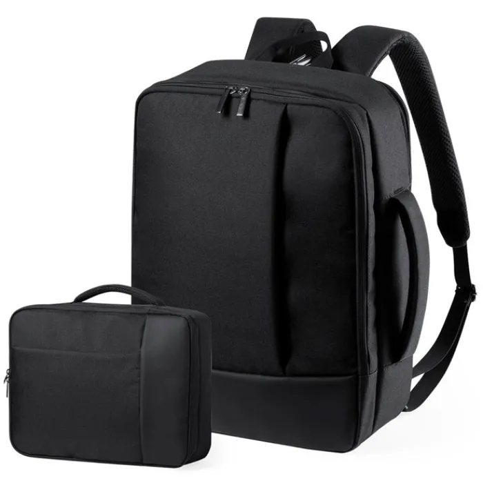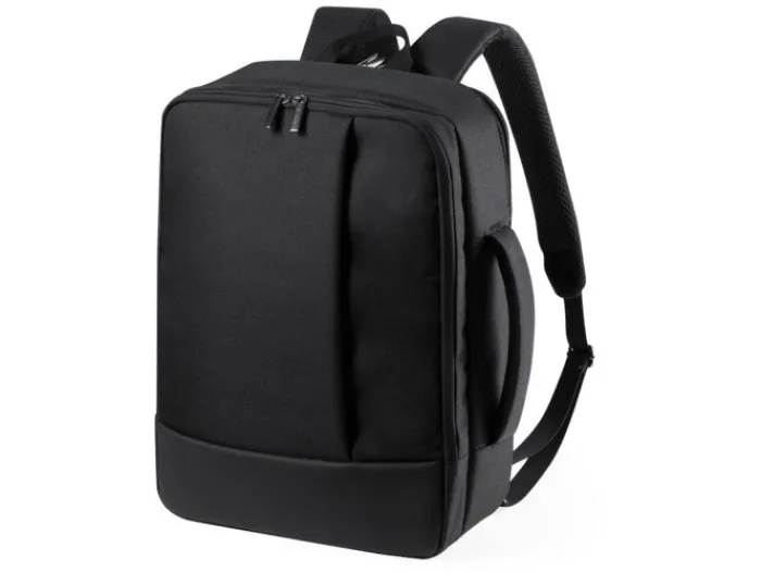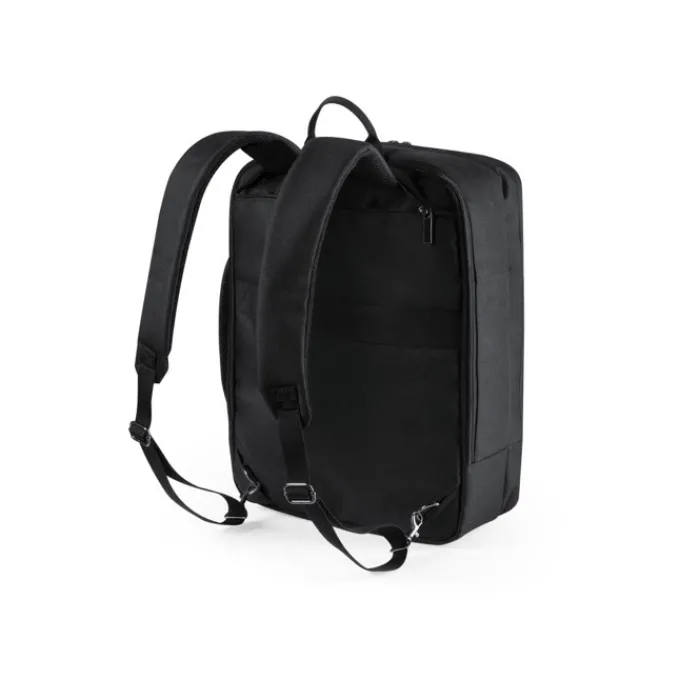 Zaino portadocumenti in una combinazione di resistente poliestere 300D con dettagli in similpelle. Design urbano, scomparto principale con chiusura a zip a doppio tirante e tasca imbottita per notebook fino a 15 pollici. Con spallacci regolabili e maniglia laterale imbottita. Dotato di fascia per agganciarlo al trolley e tasca posteriore per nascondere gli spallacci quando lo si utilizza come cartella portadocumenti.