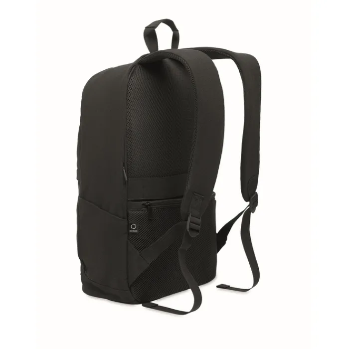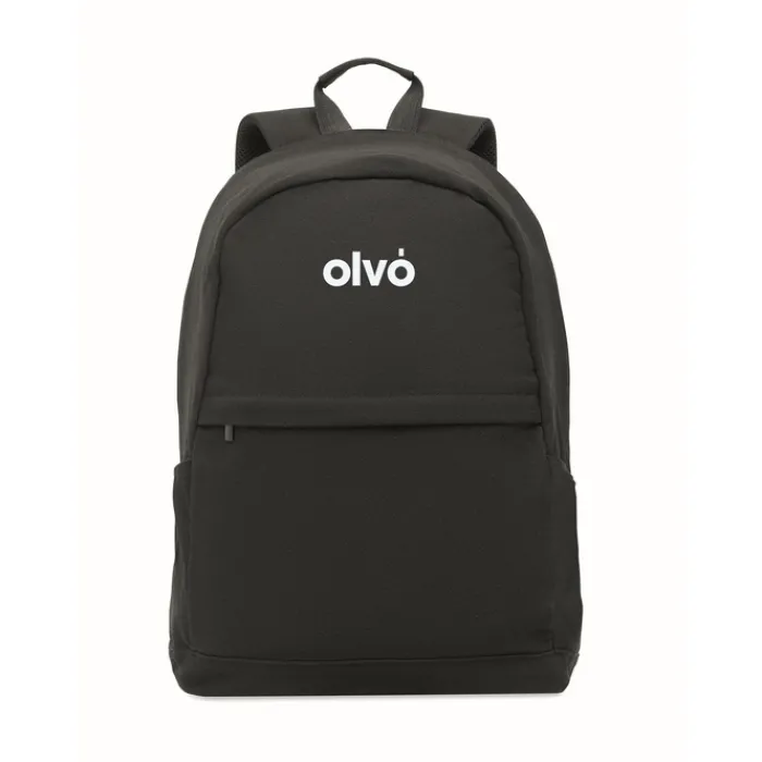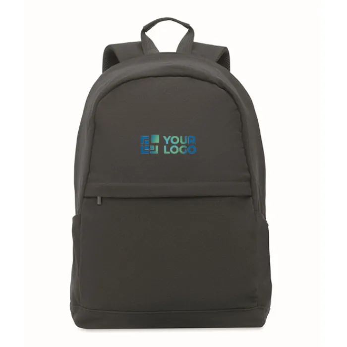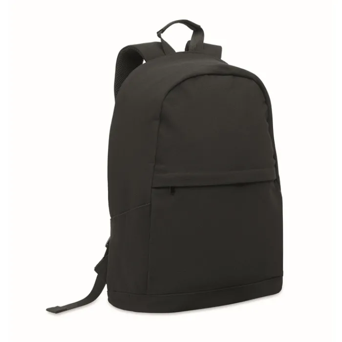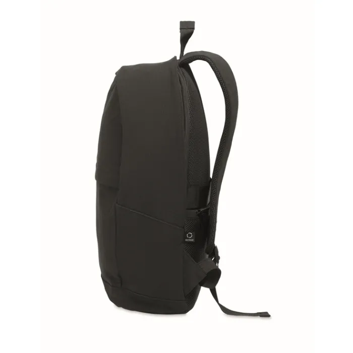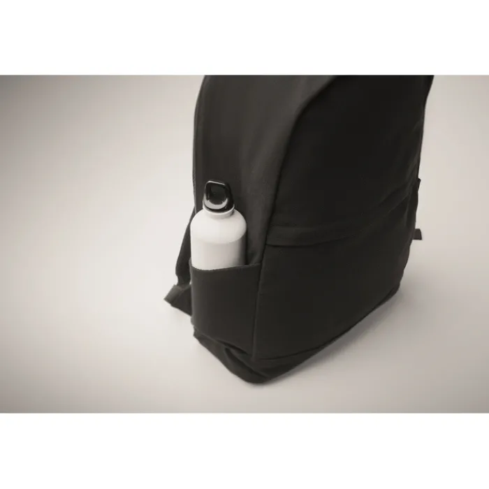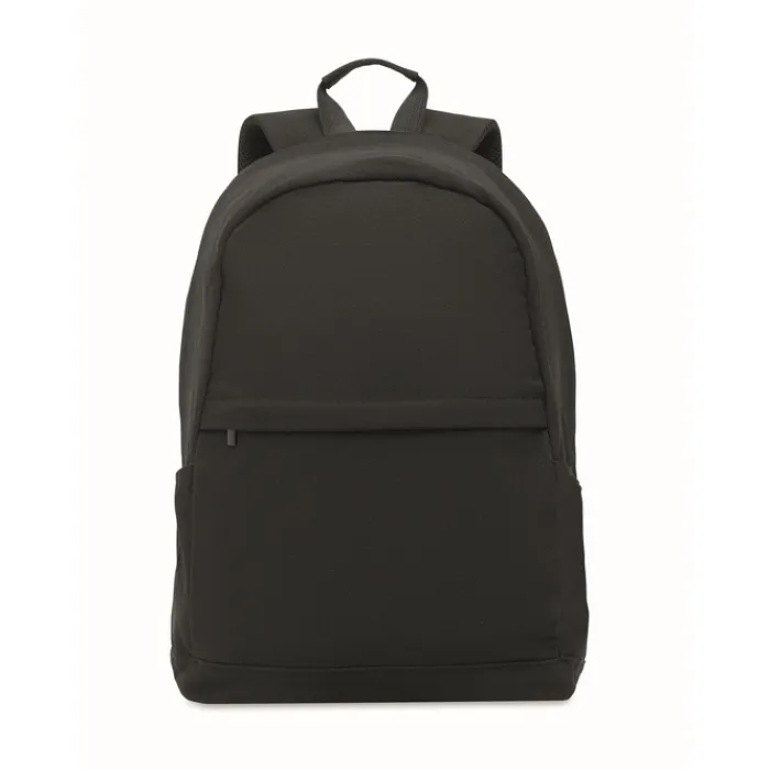 Zaino realizzato in 70% cotone riciclato pre-consumo e 30% poliestere riciclato. Ha una tasca frontale con cerniera, una tasca posteriore con cerniera e una tasca laterale aperta per borraccia. All’interno ha uno scomparto per pc portatili da 15”. Schienale e spallacci imbottiti e morbidi.