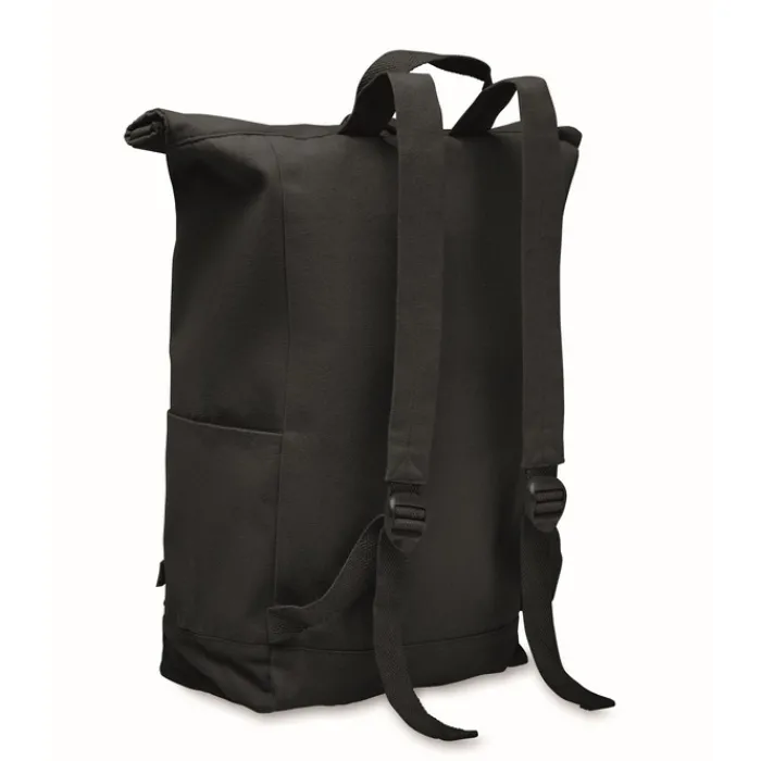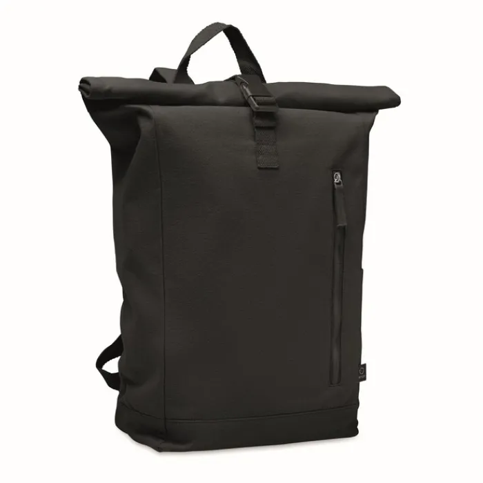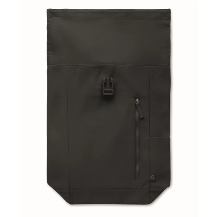 Zaino rolltop con fibbia di chiusura, realizzato all’80% con cotone riciclato e al 20% con poliestere riciclato da 390 g/m². Tasca frontale con cerniera.