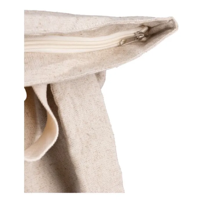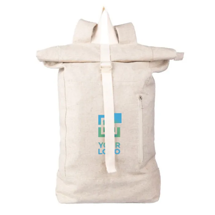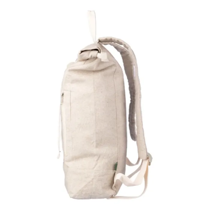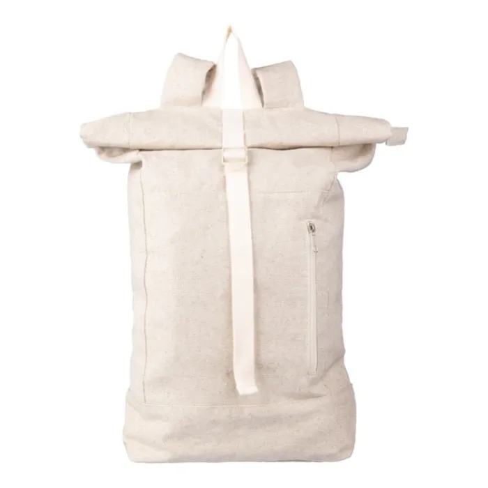 Zaino rolltop realizzato in canapa da 280 g/m² con fodera in cotone. Chiusura con fibbia. Tasca sul davanti con chiusura zip verticale. Spallaci regolabili. Presenta l’etichetta con il logo della canapa.