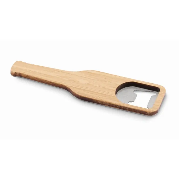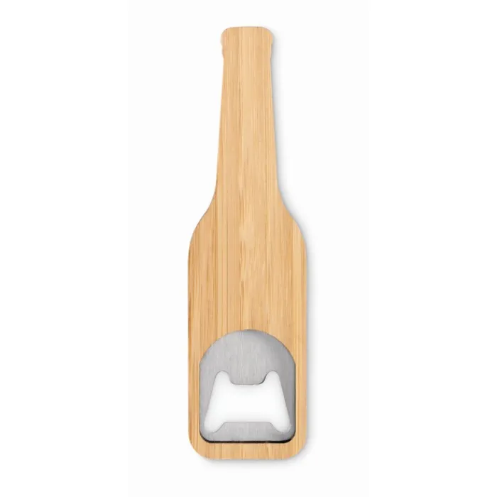 Apribottiglie magnetico a forma di bottiglia realizzato in acciaio inossidabile e bambù.