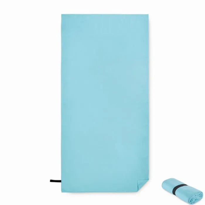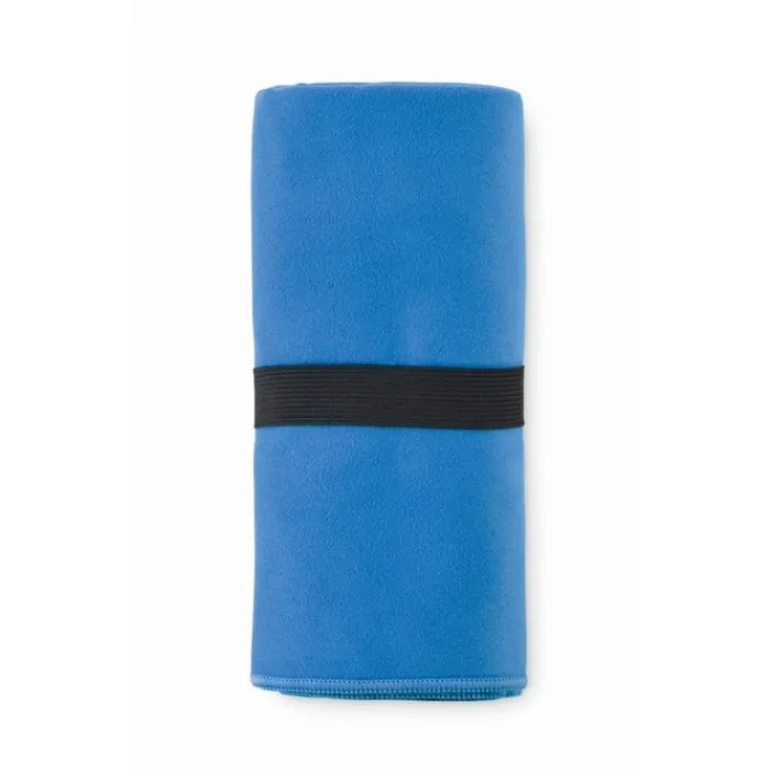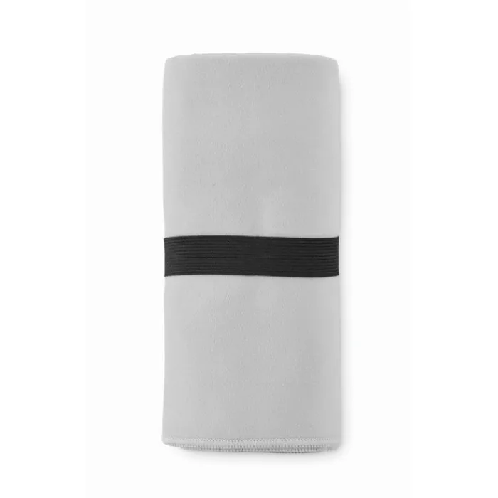 Asciugamano sportivo realizzato in microfibra vellutata double face da 200 g/m². Una volta arrotolato ha un cinturino di chiusura con bottone a pressione.