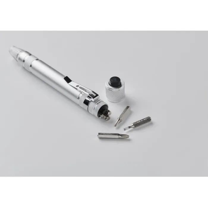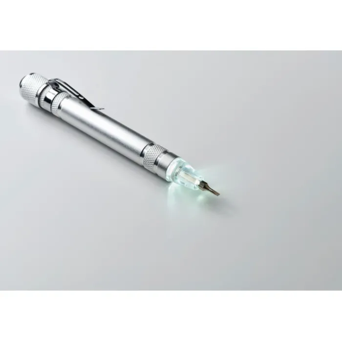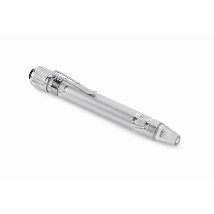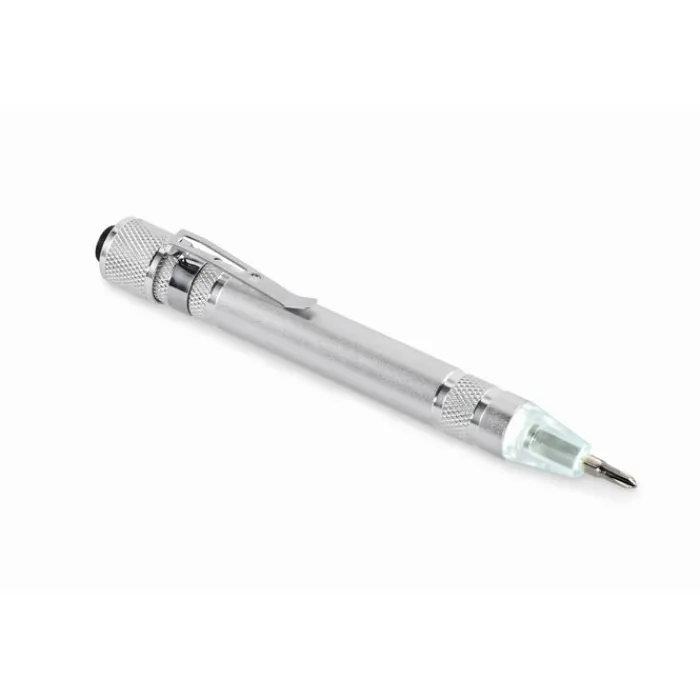 Utensile multiuso realizzato in alluminio riciclato a forma di penna con torcia. Include 3 cacciavite con testa piatta e 3 con testa a croce. Funziona con 4 batterie a bottone LR41 che vengono incluse.