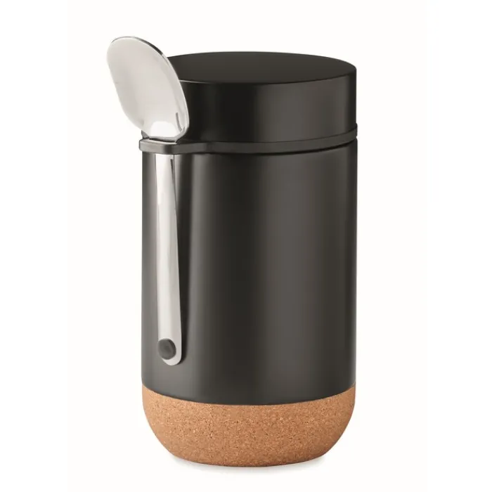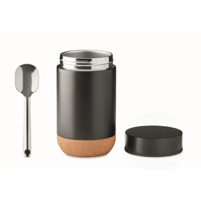 Barattolo in acciaio inossidabile a doppia parete con tappo a vite e base in sughero. Include un cucchiaino. Capacità: 400 ml. Non può essere inseirito nel microonde, né puó essere lavato in lavastoviglie.