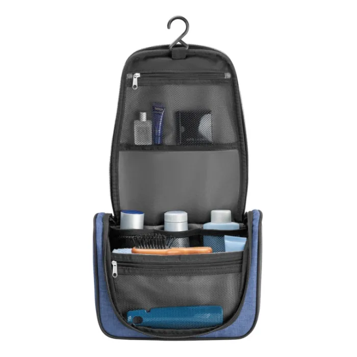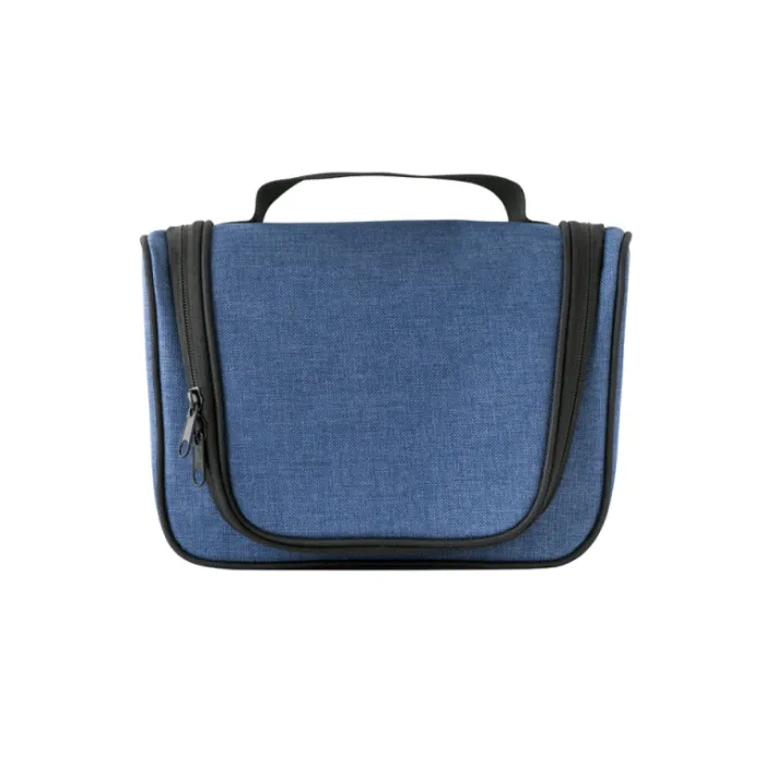 Beauty case da viaggio in 600D ad alta densità. Lo scomparto principale ha una doppia cerniera e un rivestimento interno in 210D. Ha diverse tasche interne e un gancio a stampella sulla parte superiore per appenderlo.