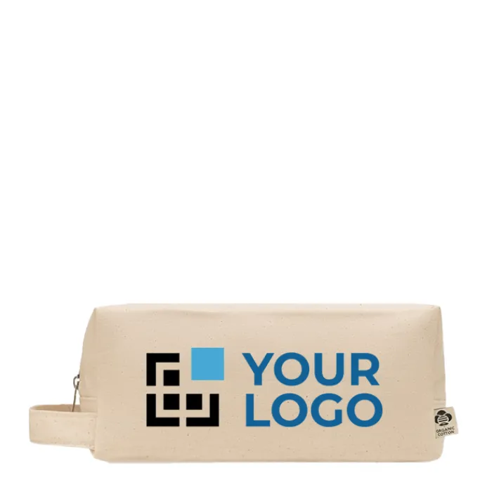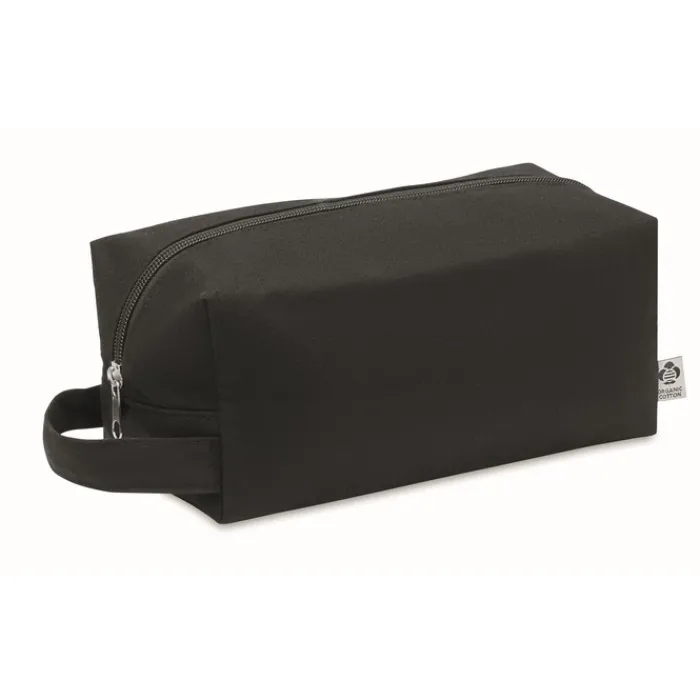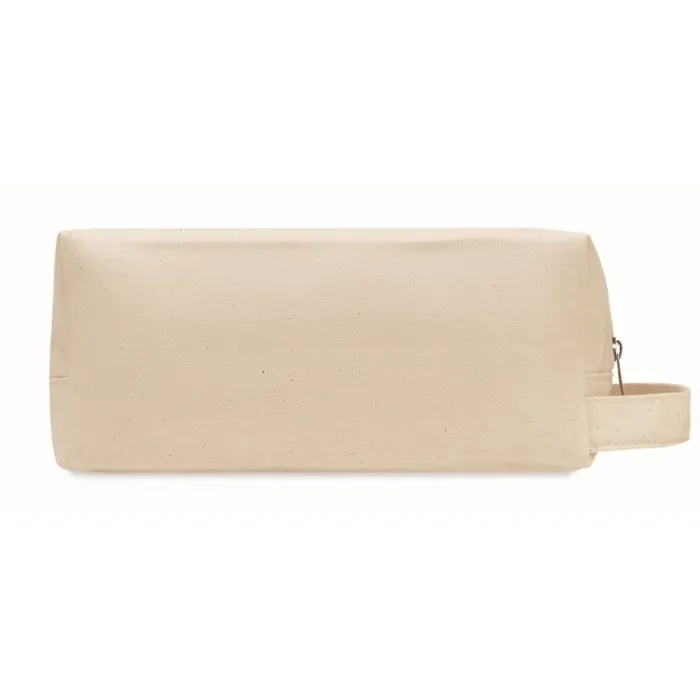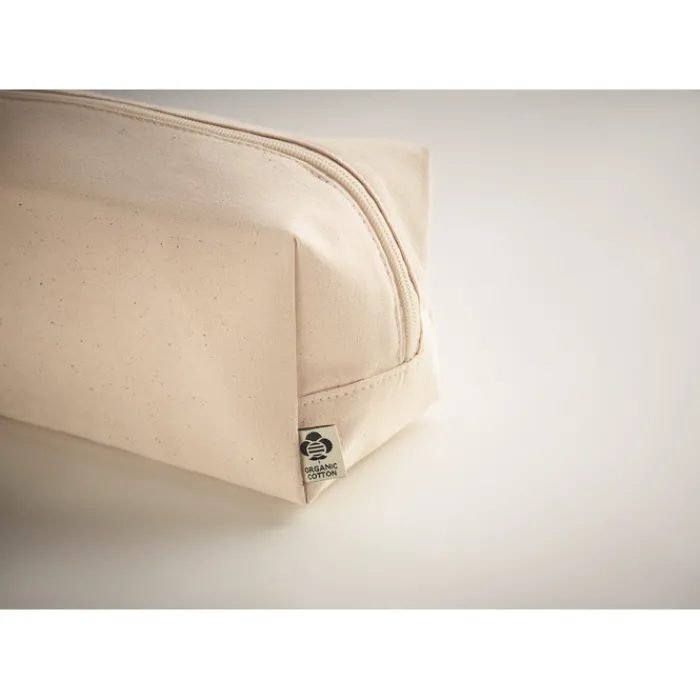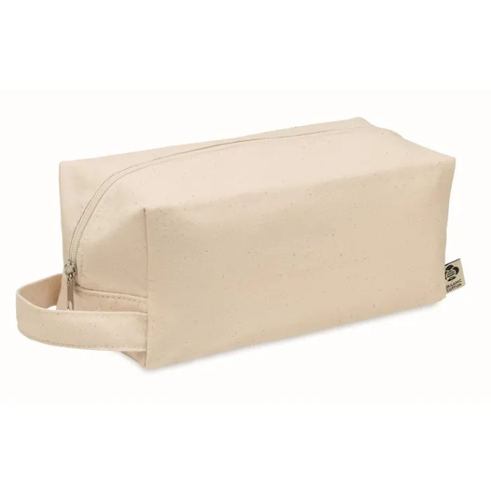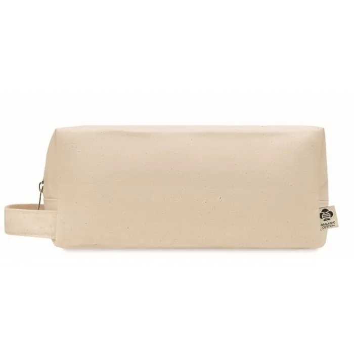 Beauty case con cerniera realizzato in tela organica da 220 gr/m². Ha una maniglia laterale e un fondo in PU. La fodera è in cotone organico da 140 gr/m².