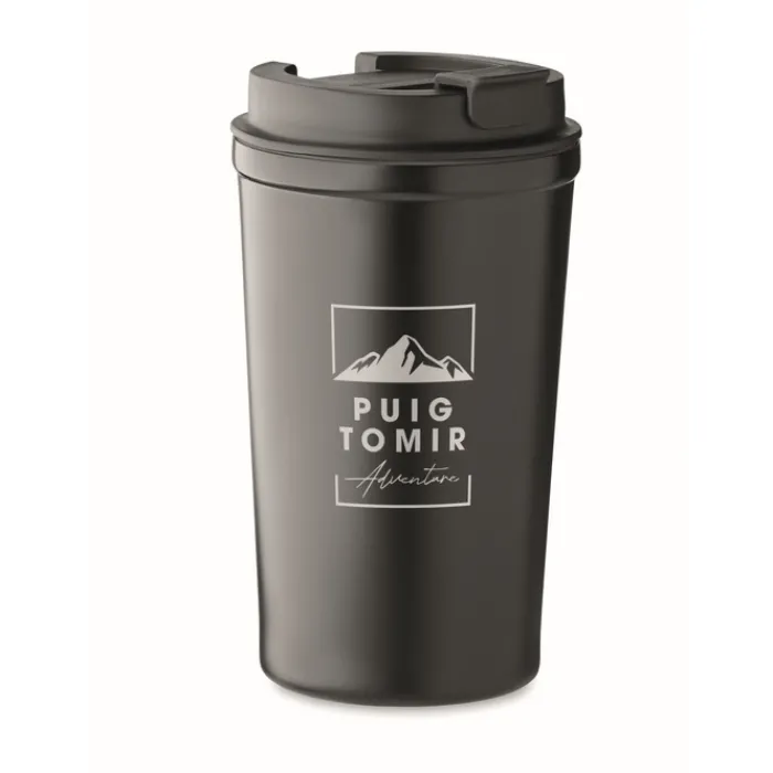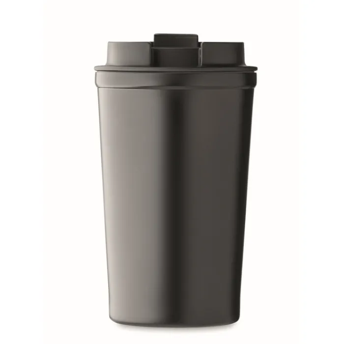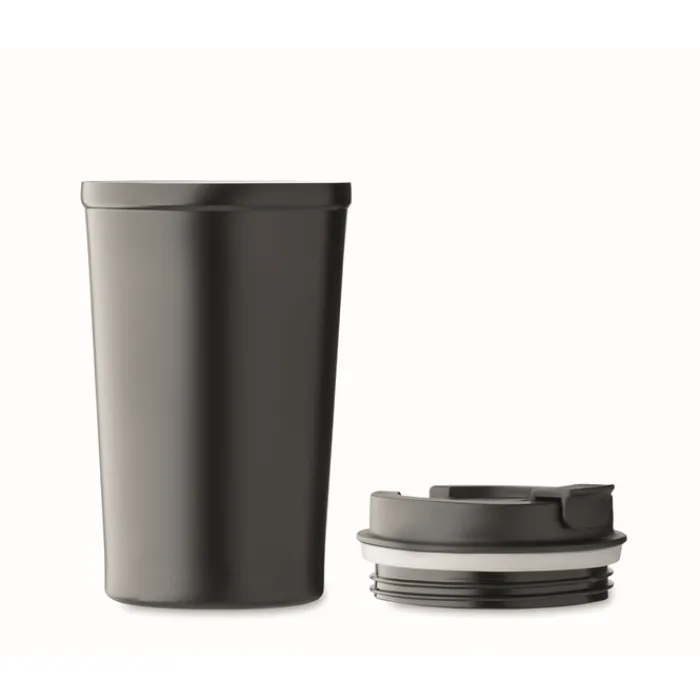 Bicchiere da asporto a doppia parete con isolamento sottovuoto in acciaio inox riciclato (90% acciaio inox riciclato e 10% acciaio inox) con rivestimento interno in ceramica. Tappo antifuga. Capacità: 450 ml.