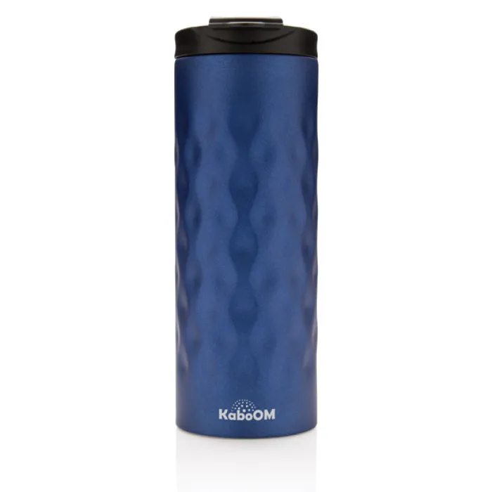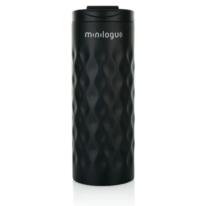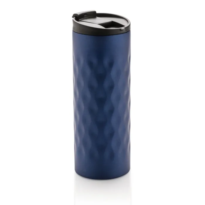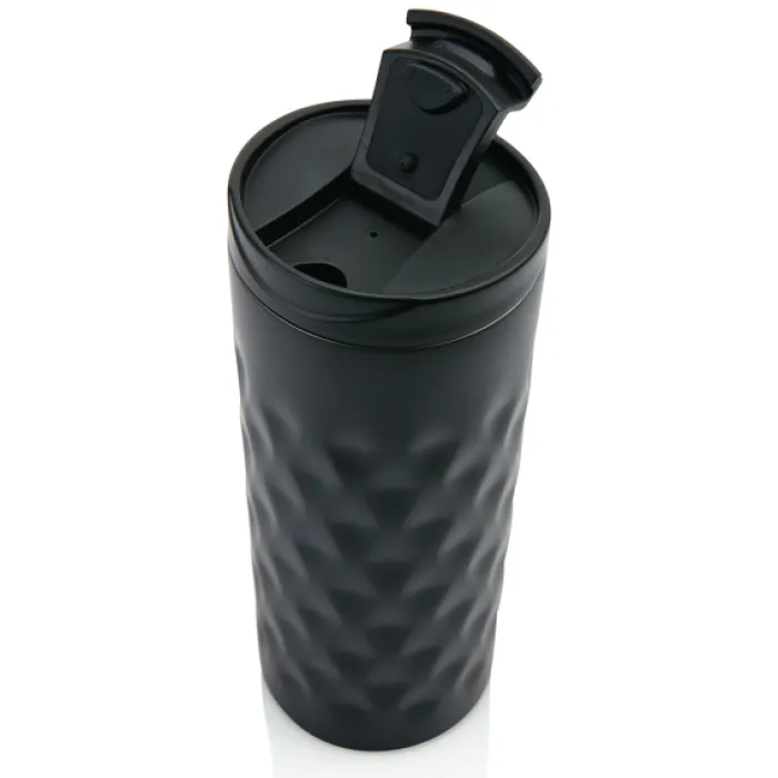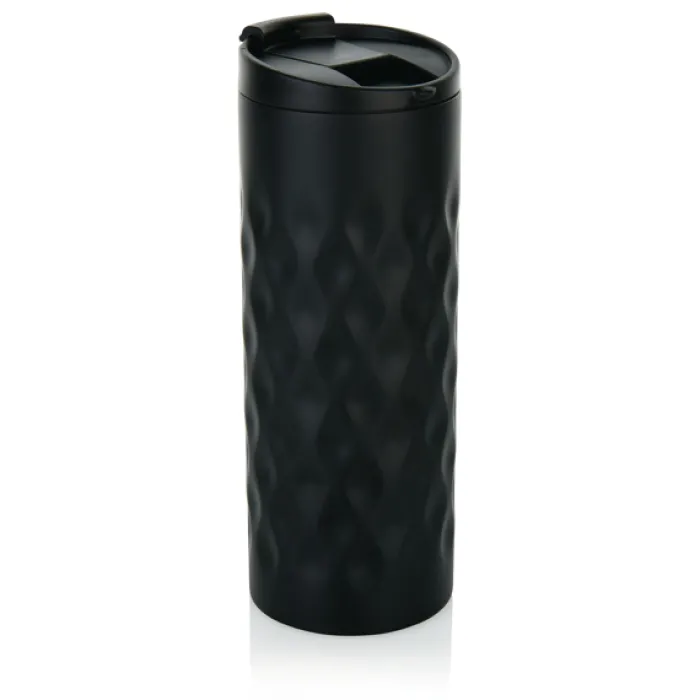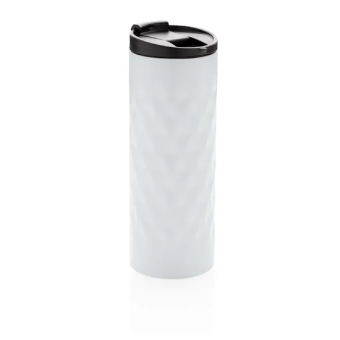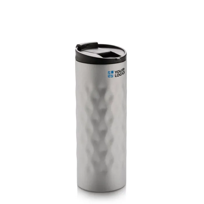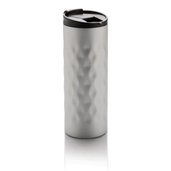 Bicchiere con tappo ermetico realizzato in acciaio con doppio strato e motivi geometrici decorativi. Capacità 350 ml.