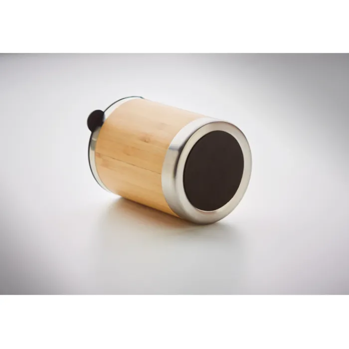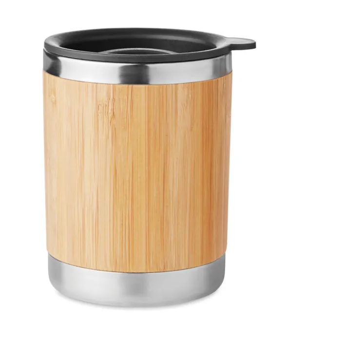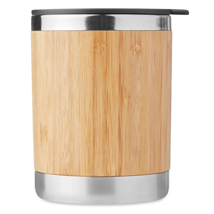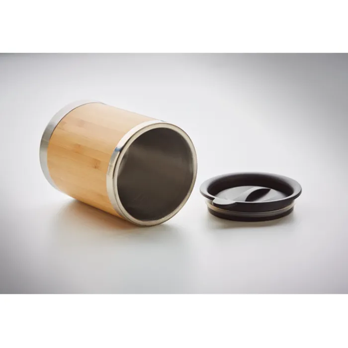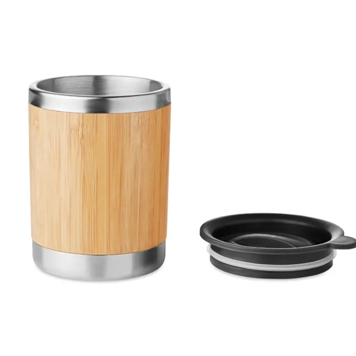 Bicchiere da viaggio in acciaio inossidabile con esterno in bambù con coperchio. Capacità 250ml. Il bambù è un materiale naturale quindi si possono verificare variazioni di colore tra un articolo e l’altro.