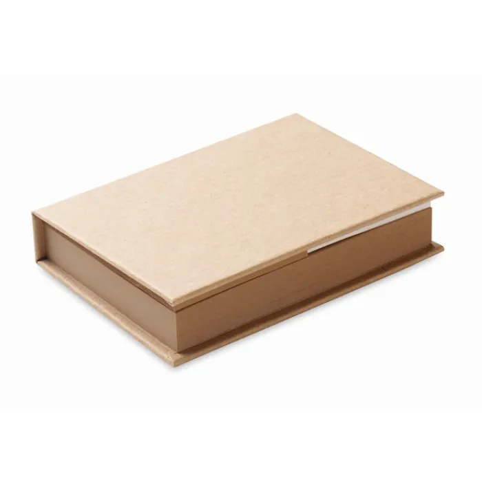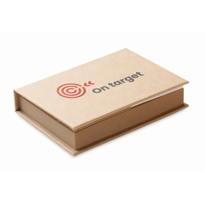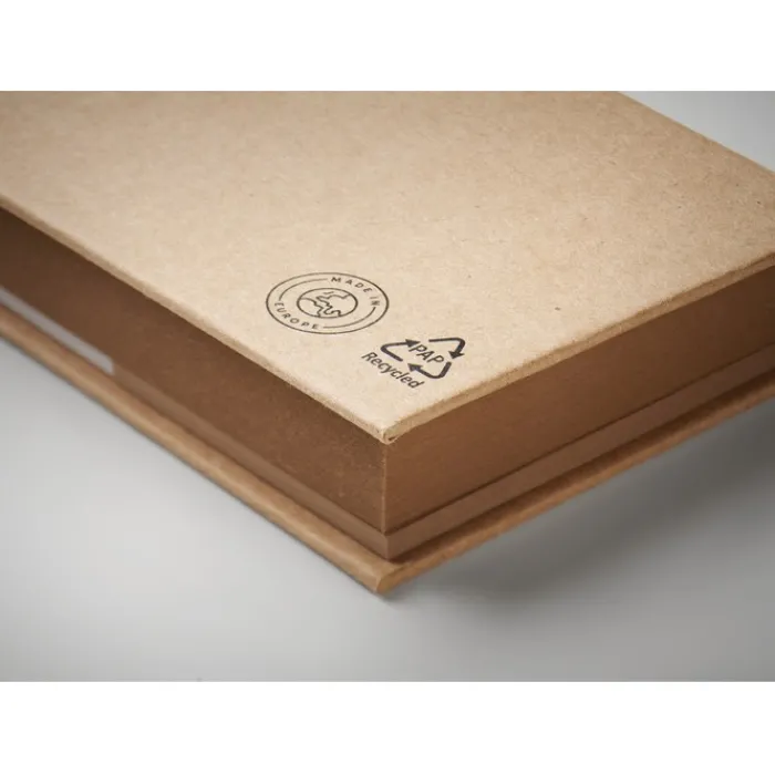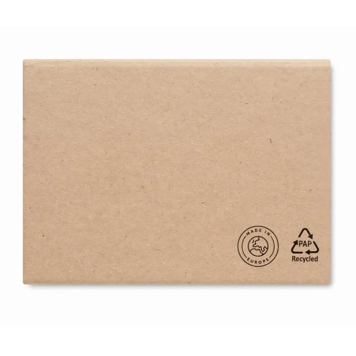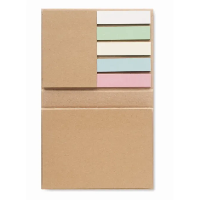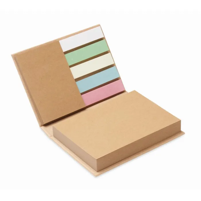 Blocchetto di post-it con copertina in carta riciclata. Contiene 2 blocchetti adesivi uno grande ed uno medio e 5 segnapagina in colori assortiti. Prodotto in UE.