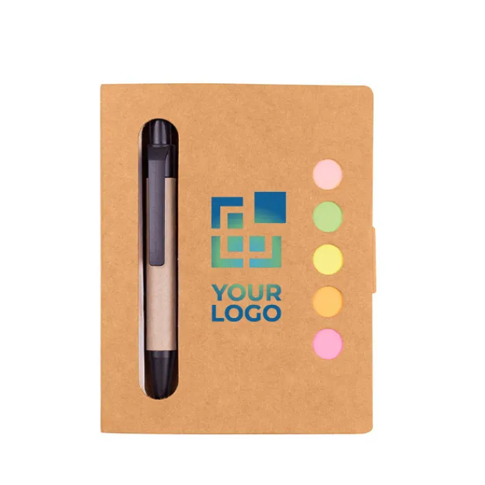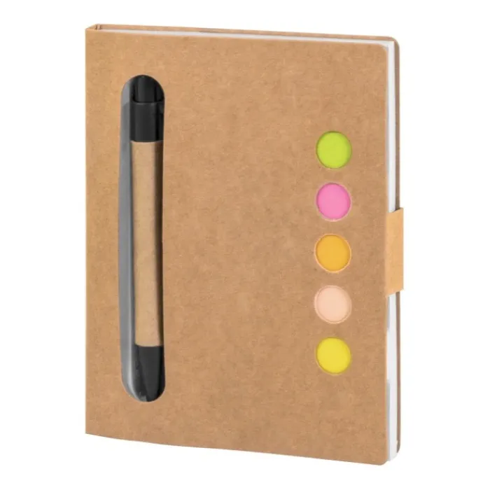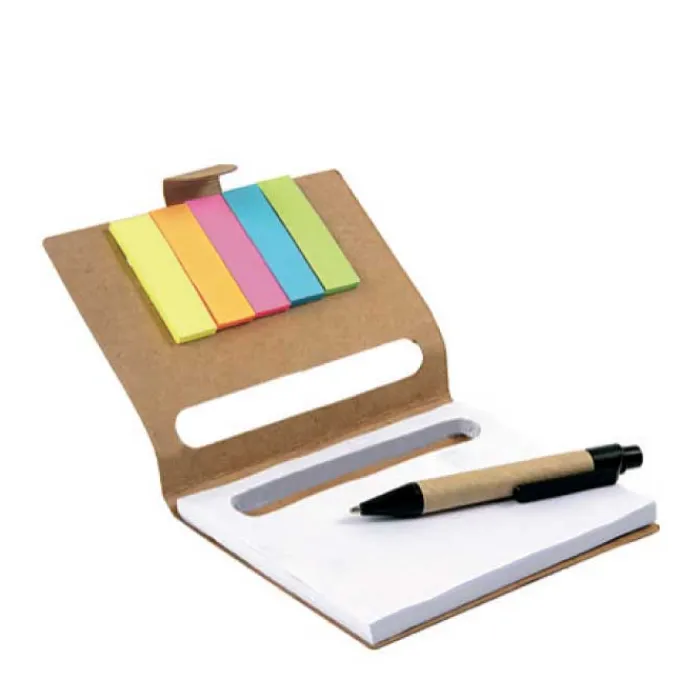 Mini blocco note in cartone riciclato con 50 pagine neutre e contenente segnapagina adesivi di cinque colori differenti e una piccola penna abbinata.