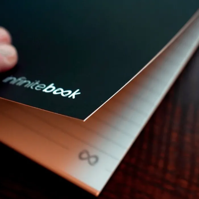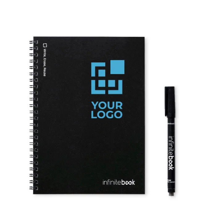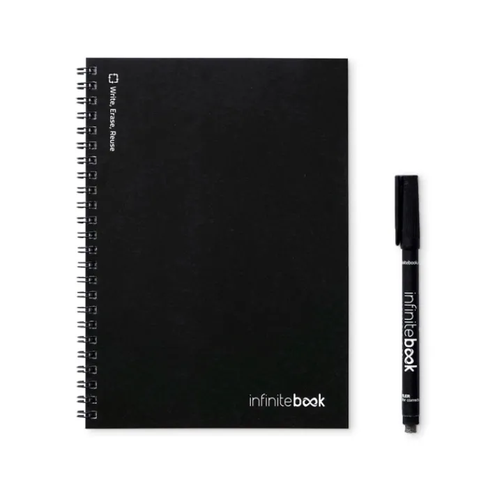 Block notes A5 – “Infinitebook” – con copertina flessibile e spirale colorata. Contiene 15 pagine stile lavagna bianca e un pennarello nero. Questo quaderno consente di cancellare facilmente quello che si scrivere ed è una soluzione pratica per ridurre al minimo il consumo di carta. Le note possono essere scannerizzate. Prodotto in Europa. Fornito in una busta di carta kraft con un adesivo