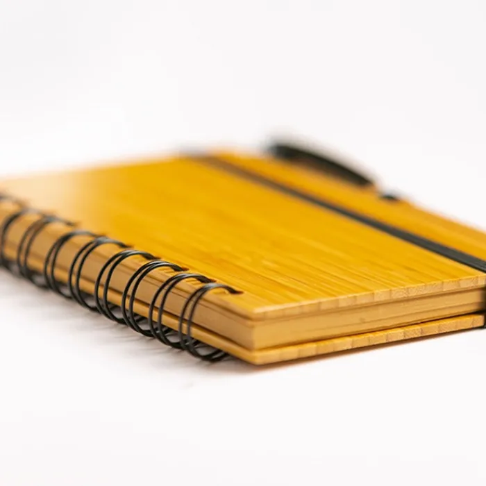 Block notes formato A6 con copertina in bambù e spirale laterale. Contiene 140 pagine a righe in carta riciclata da 70g/m². Include una penna in bambù con inchiostro blu e sistema a pressione. Entrambi gli elementi sono personalizzabili.