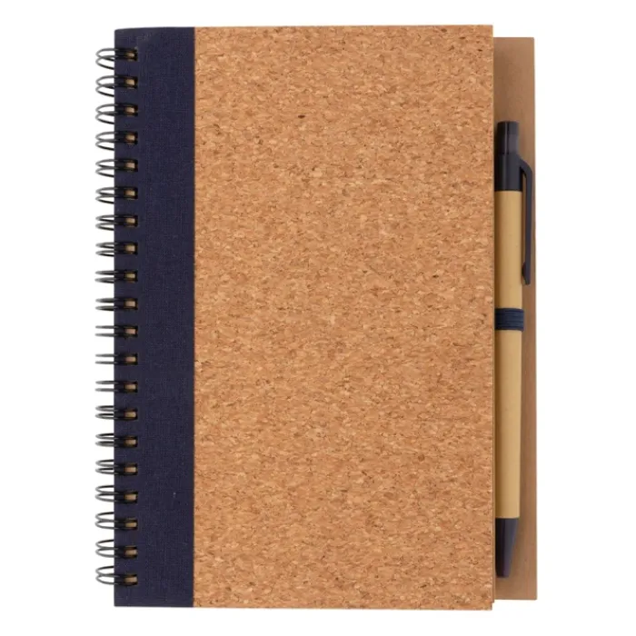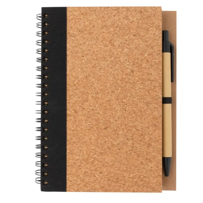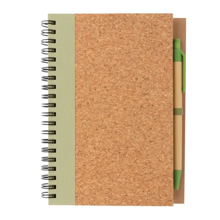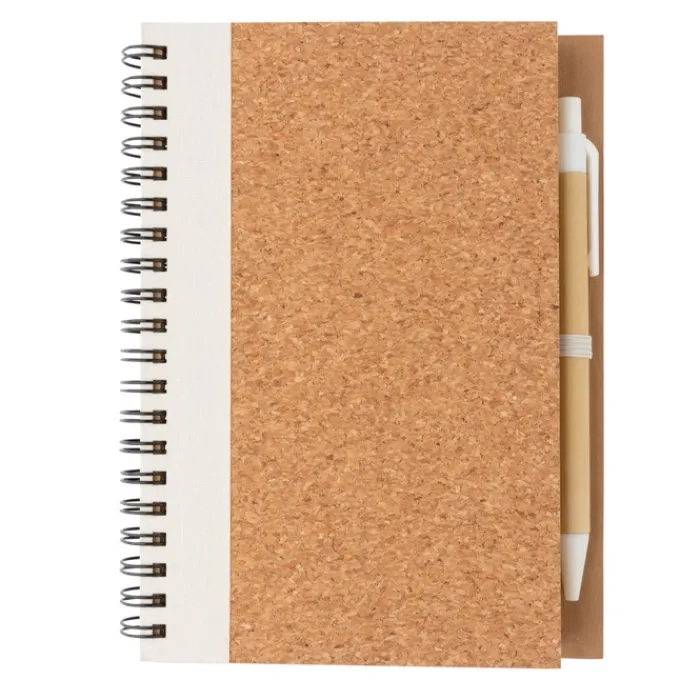 Block notes con spirale laterale con copertina in sughero e penna. All’interno contiene 70 pagine a righe color crema in carta riciclata da 70 g/m². Il corpo della penna è in cartoncino con dettagli colorati abbinati e ha un inchiostro blu German Dokumental.