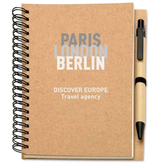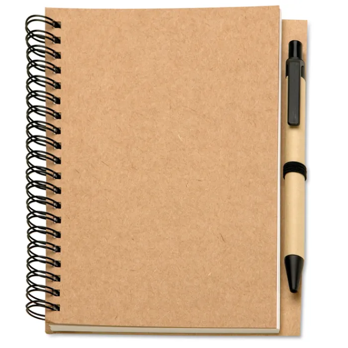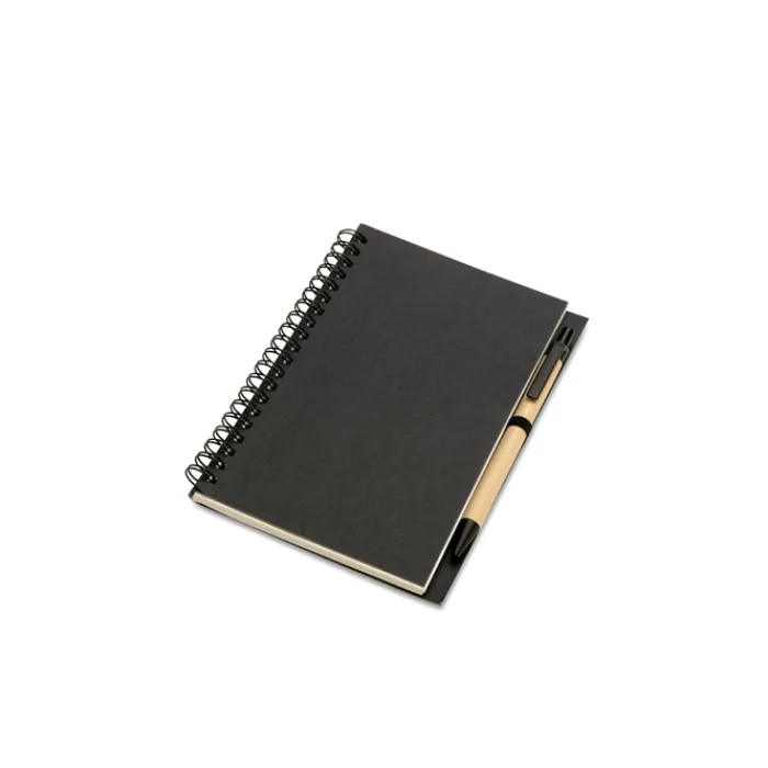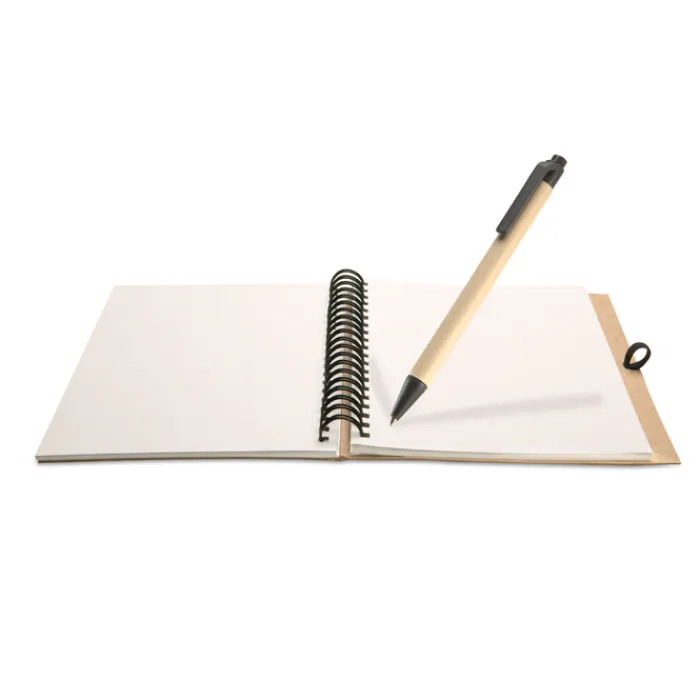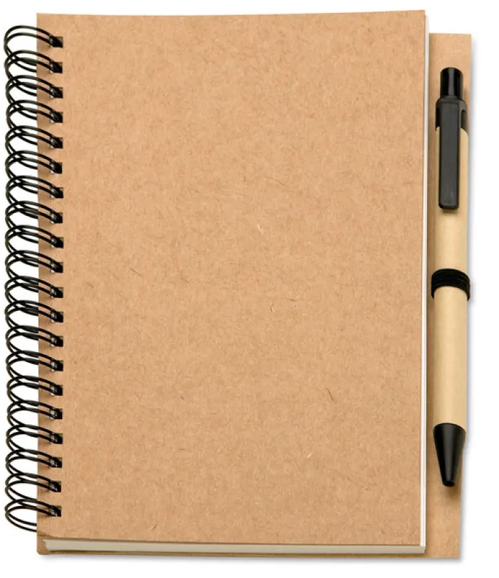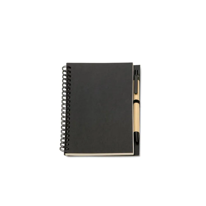 Notebook (70 fogli neutri) in carta riciclata con penna a sfera in cartone riciclato e parti in plastica biodegradabile. Inchiostro blu.