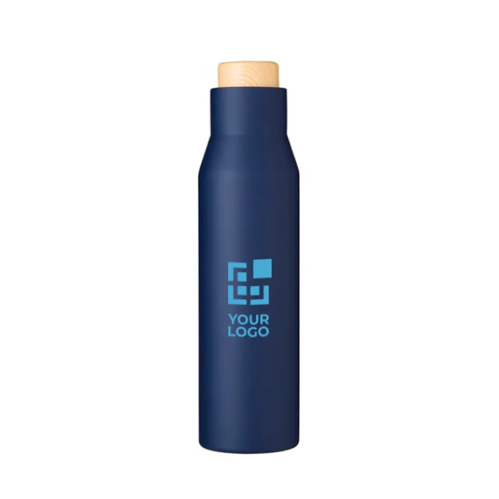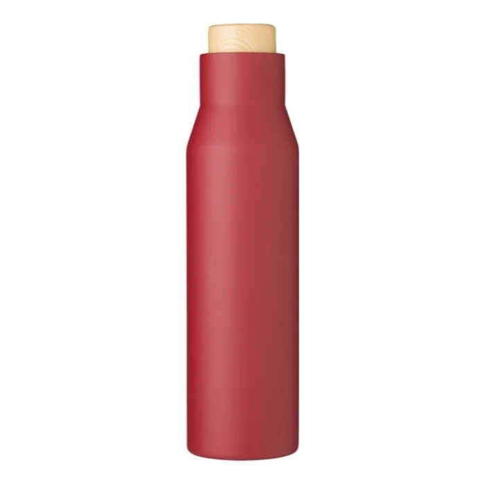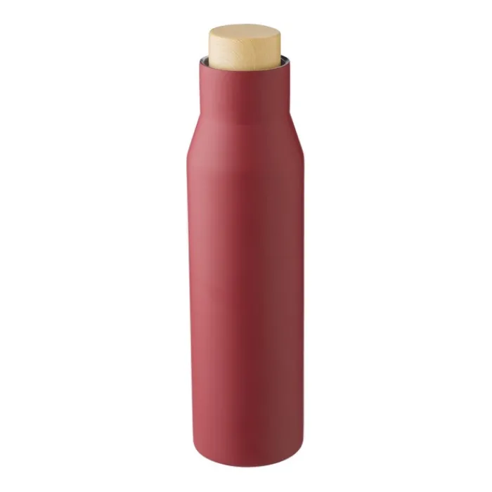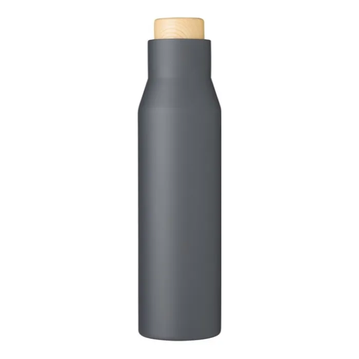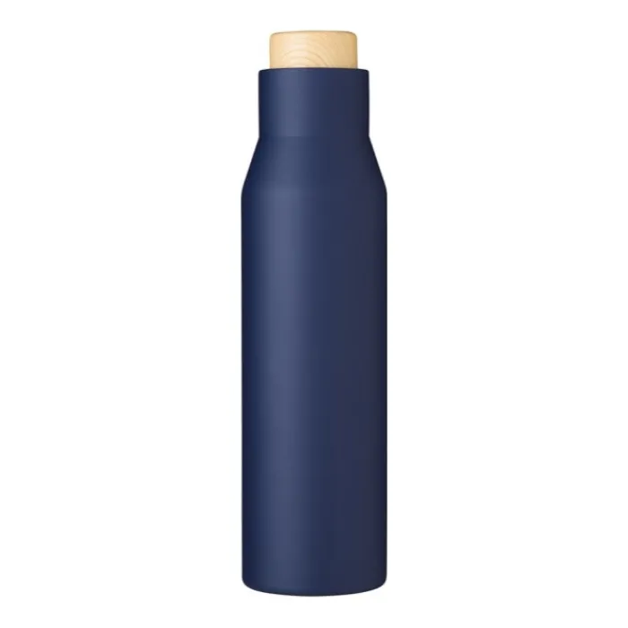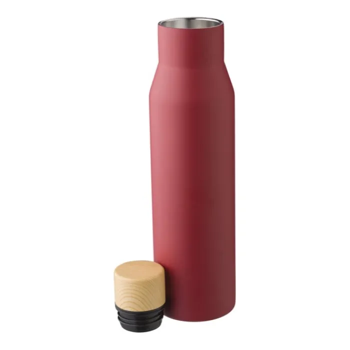 Borraccia in acciaio inox 304 a doppia parete con tappo in legno da 500 ml. Confezionata singolarmente in una scatola in cartone color avana.