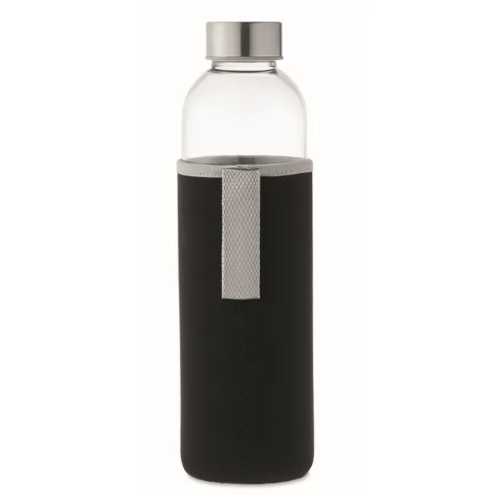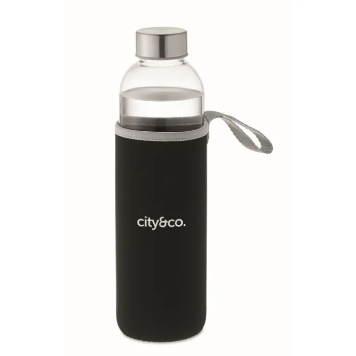Bottiglia in vetro con custodia in neoprene con tappo anti perdite. Non adatta per bevande gassate. Capacità: 750 ml.
