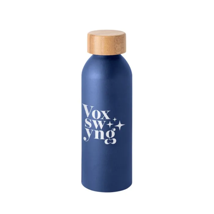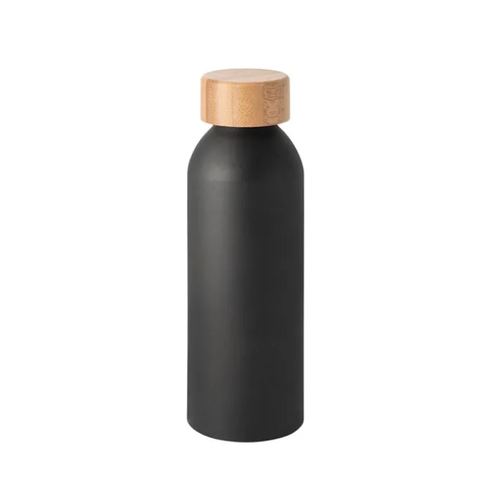 Borraccia in alluminio con finitura opaca e coperchio in bambù. È un prodotto ecologico e adatto anche alle bevande fredde. Capacità fino a 550 ml.