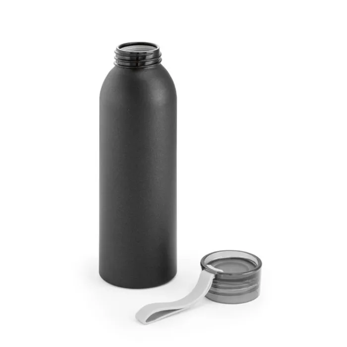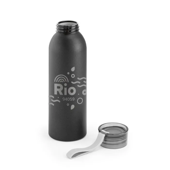 Borraccia sportiva in alluminio con tappo in PP e laccetto in silicone per facilitarne il trasporto. Capacità fino a 660 ml.