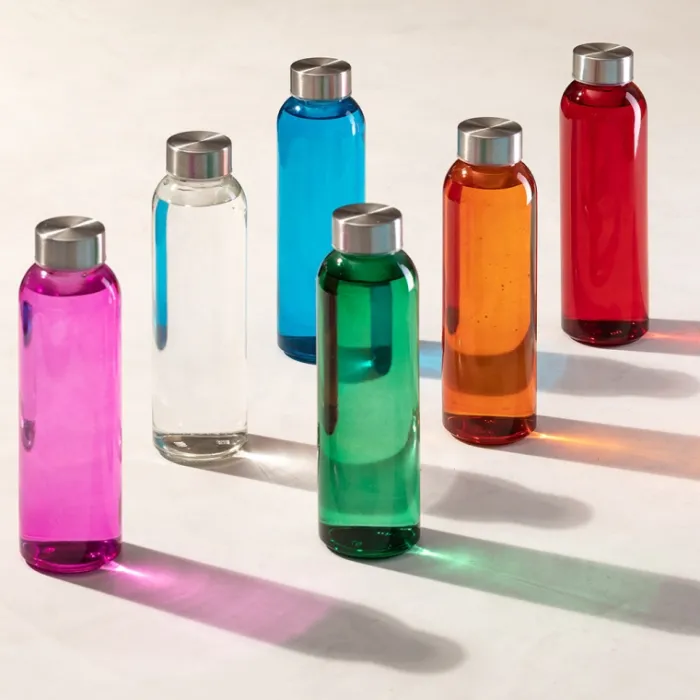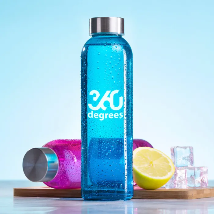 Borraccia in vetro di alta qualità da 500 ml, con corpo dai colori trasparenti in materiale privo di BPA e tappo a vite in acciaio inossidabile. Presentata in un’attraente scatola di design.