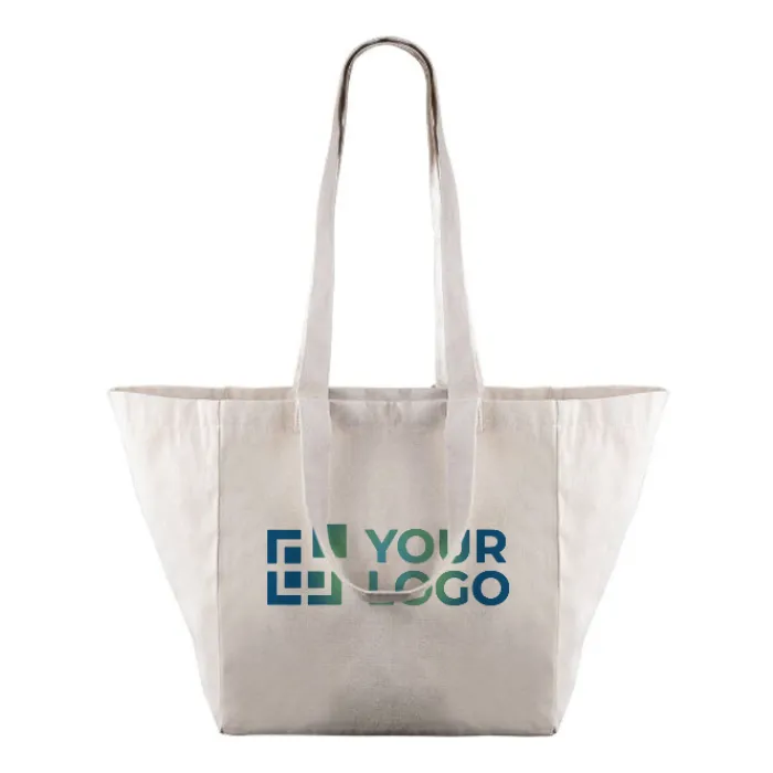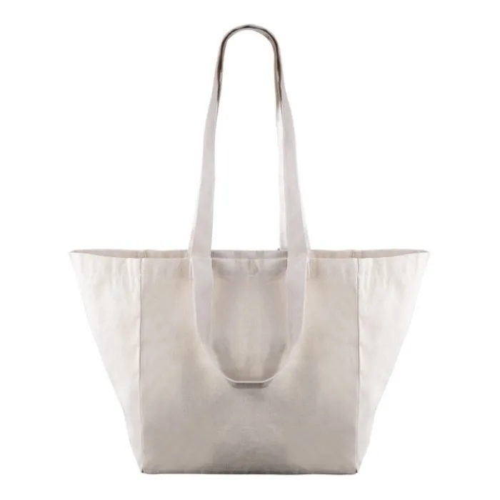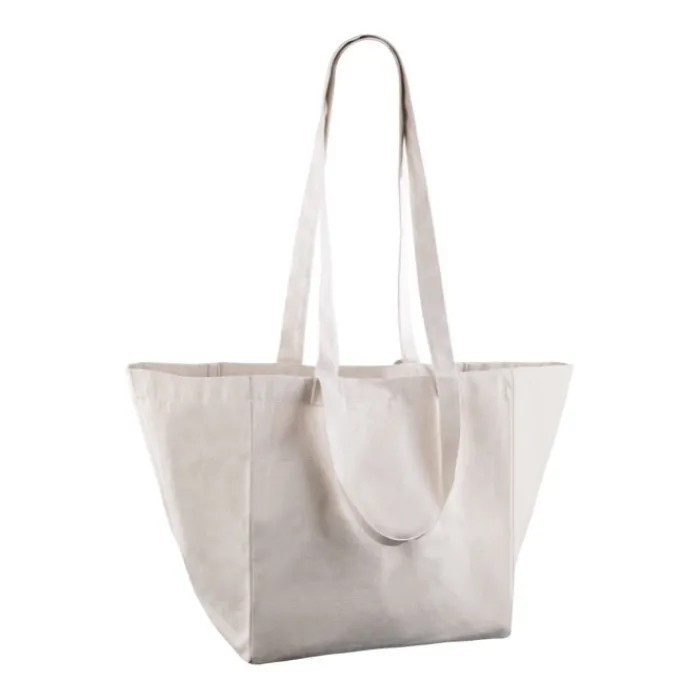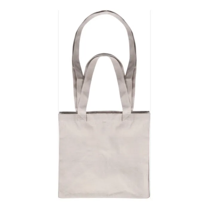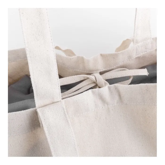 Borsa a barca con doppi manici corti 50 cm e lunghi 80cm e larghi 3cm. Realizzata in canvas naturale di cotone da 220 gr/m². Cordoncino interno per chiuderla. Supporta fino a 14kg di peso.