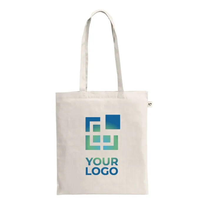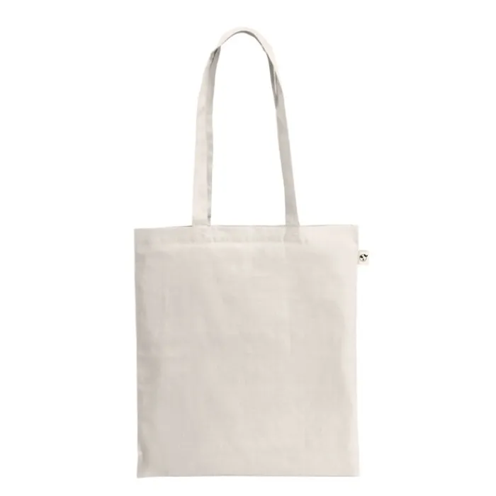 Borsa in 100% cotone riciclato (180 g/m²), con manici da 65 cm. Il cotone riciclato è di colore solido e non tinto. La materia prima viene utilizzata nella sua forma e colore originali, senza l’uso di sostanze chimiche di tintura o sbiancamento, contribuendo ad un impatto ambientale minore. Il colore tinta unita è ottenuto scegliendo il filato riciclato con la stessa tonalità, per cui potrebbero apparire impurità e variazioni di colore