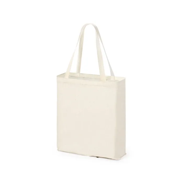 Borsa pieghevole con chiusura a cerniera, tasca interna e finitura cucita. Realizzata al 100% con cotone da 110 g/m² e base in iuta. Manici da 57 cm con rinforzo. Può sopportare fino a 8 kg di peso.