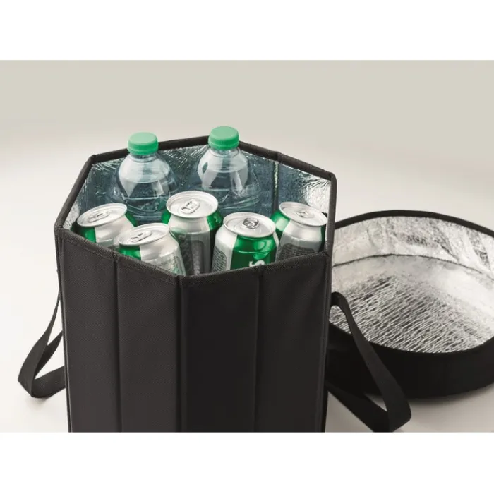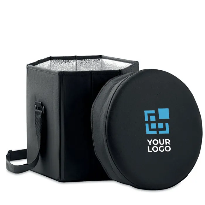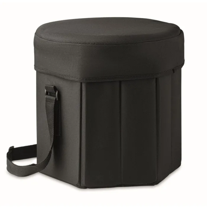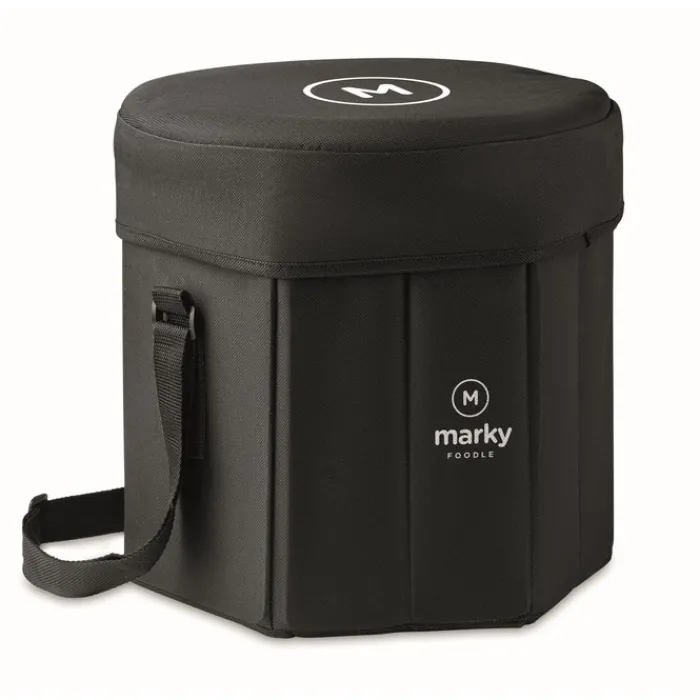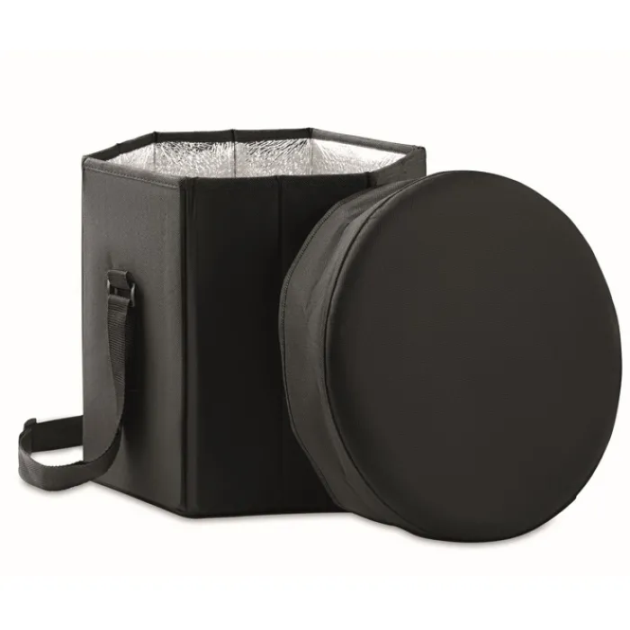 Borsa termica in poliestere 600D con isolamento isotermico in alluminio. Tracolla regolabile. Si può utilizzare come sgabello o piccolo tavolino supportando un peso massimo di 80 kg.