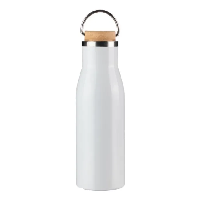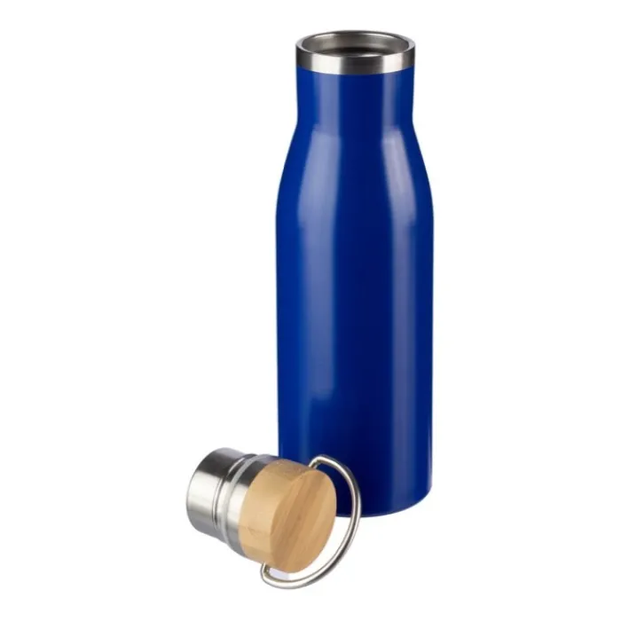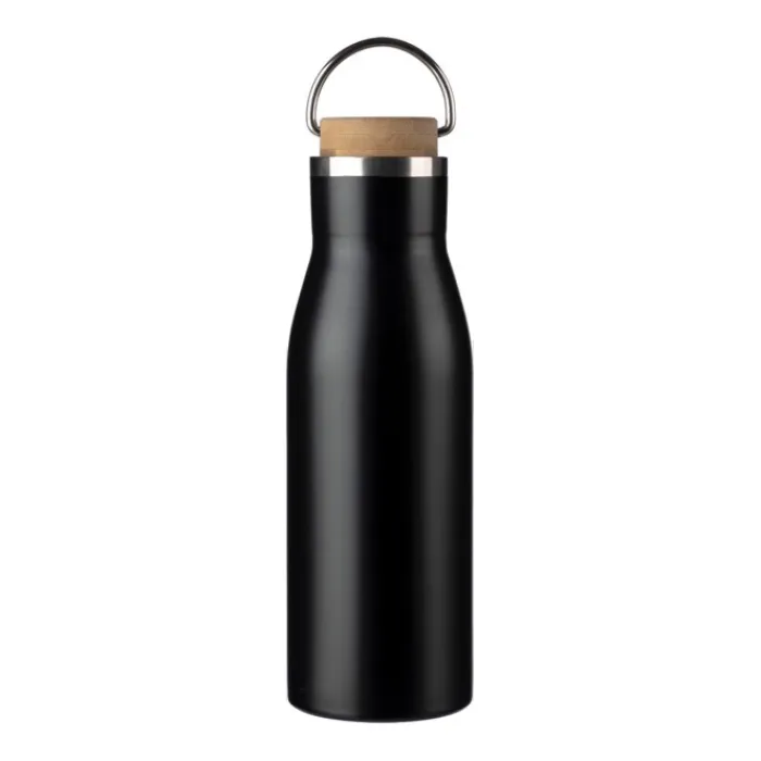 Borraccia in acciaio inox riciclato con tappo a vite in bambù e piccolo manico per il trasporto. L’interno è in acciaio inox 304, mentre l’esterno in acciaio inox 201. Su un lato, al centro in basso, ha il logo dell’alluminio riciclato inciso. Capacità: 500 ml. Confezionata singolarmente in una scatola in cartone.