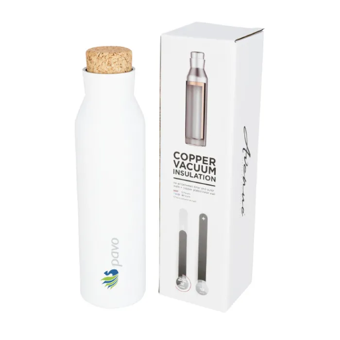 Borraccia termica personalizzata con struttura a doppia parete in acciaio inossidabile con isolamento in rame, che consente alla vostra bevanda di rimanere calda o fredda per ore, ed impedisce, inoltre, la formazione di condensa sulla parte esterna. La borraccia è dotata di un tappo in sughero innovativo con design a vite, resistente alle fuoriuscite. Capacità di 590ml. Consegnata in una confezione regalo singola.