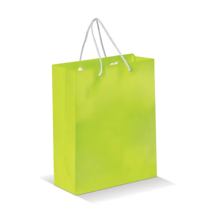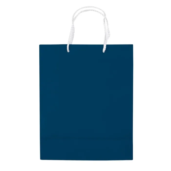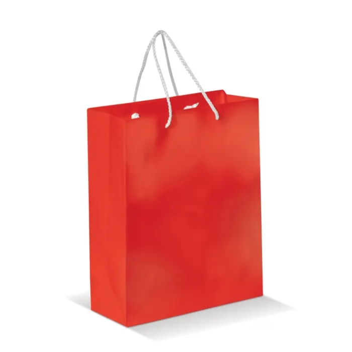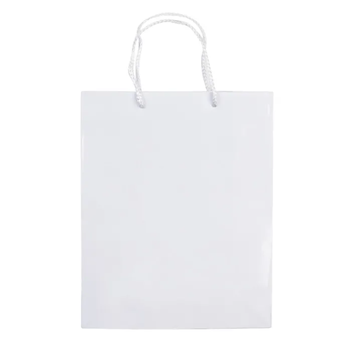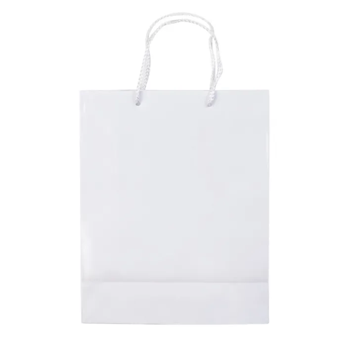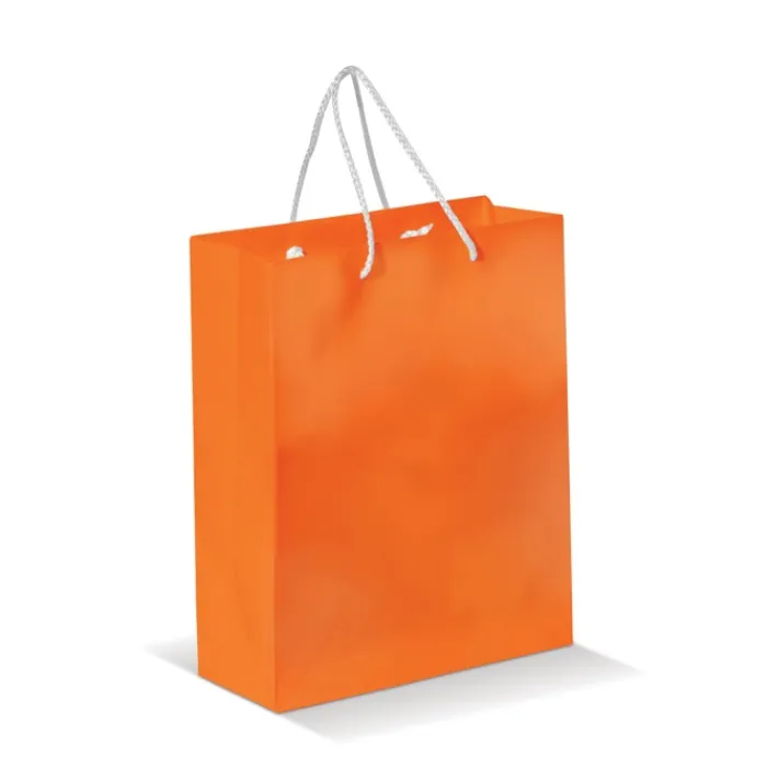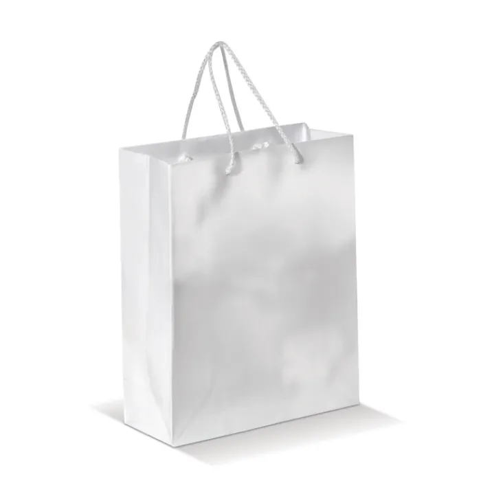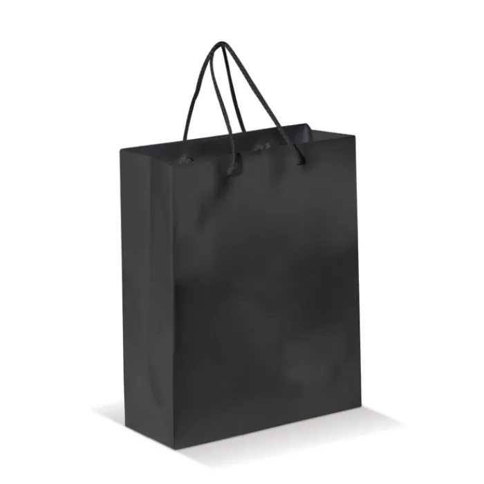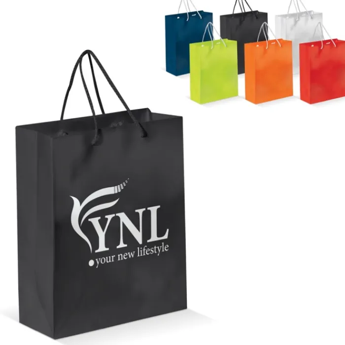 Busta di medie dimensioni in carta laminata lucida da 200g/m², robusta e capiente con manici in corda bianchi o neri da 36 cm. Supporta un massimo di 2kg.