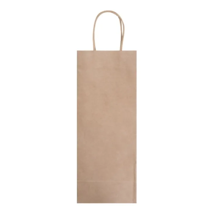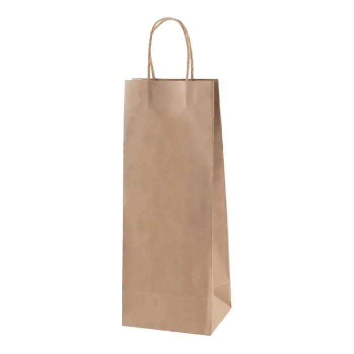 Busta di carta kraft da 120 g/m² con certificazione FSC. Manici corti arricciati. È perfetta per contenere una bottiglia di vino. Supporta fino a 3kg di peso.