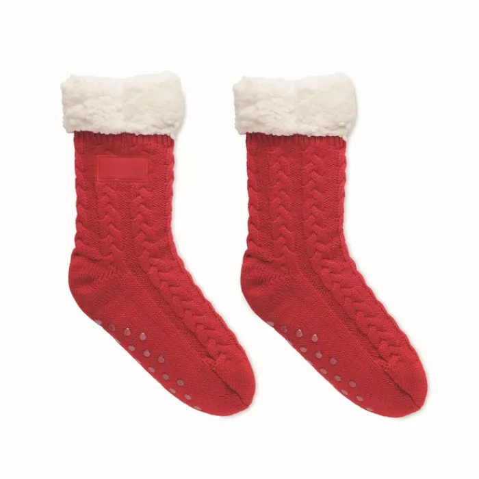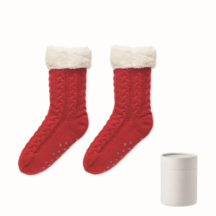 Calzini con fondo antiscivolo in maglia in filato acrilico e fodera in finto sherpa da 240 gr/m². Presentato in una confezione cilindrica di cartone. Taglia M: 36 – 39.