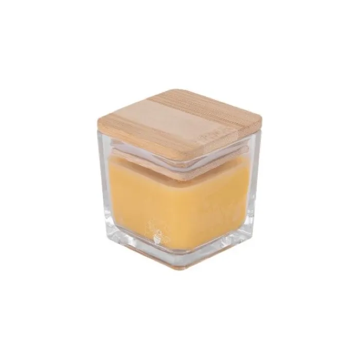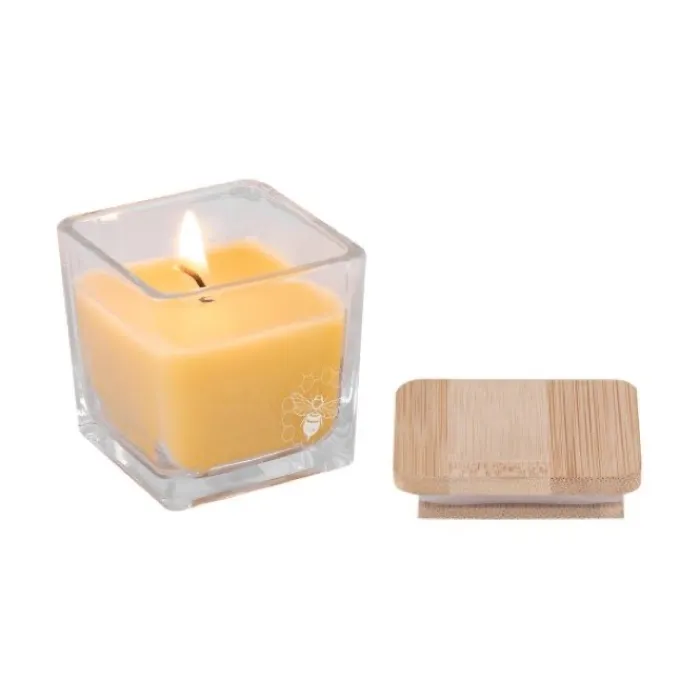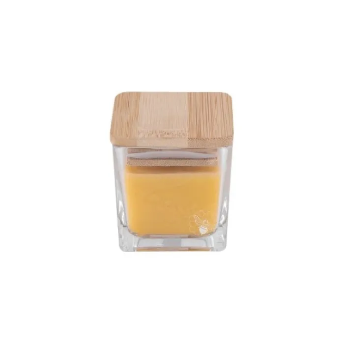 Candela da 50 grammi contenuta in un vasetto di vetro con coperchio in bambù. Ha il disegno di un d’ape su un lato perché la cera è composta al 50% da cera d’api e al 50% da cera vegetale.