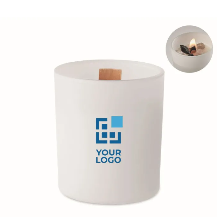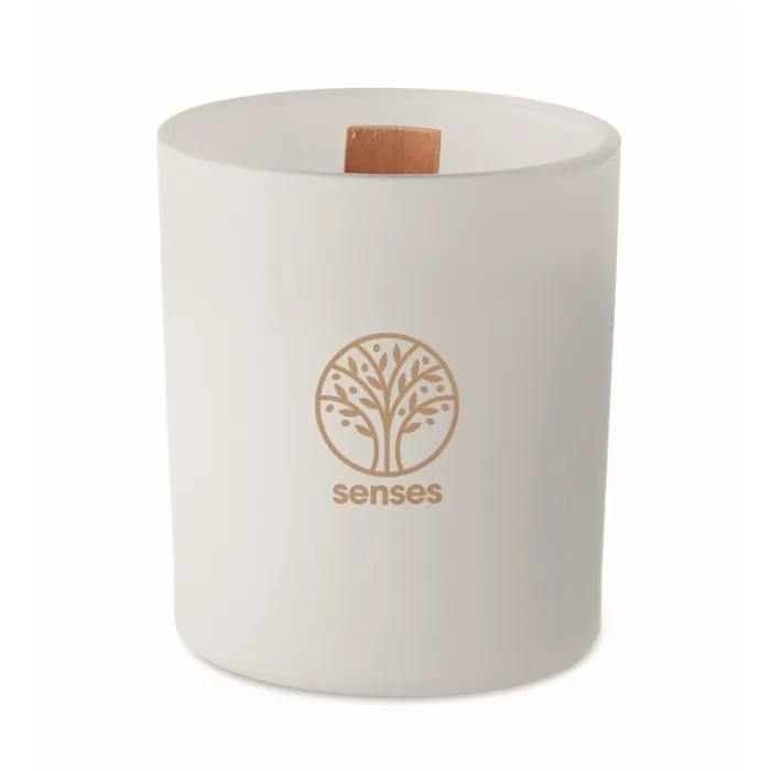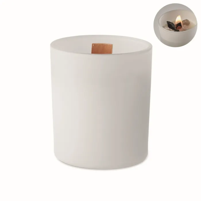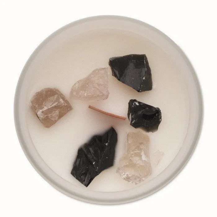Candela in cera vegetale da 200 grammi con fragranza di vaniglia, pietre e stoppino in legno. Contenuta in un bicchierino di vetro. Durata della combustione: 20 ore.