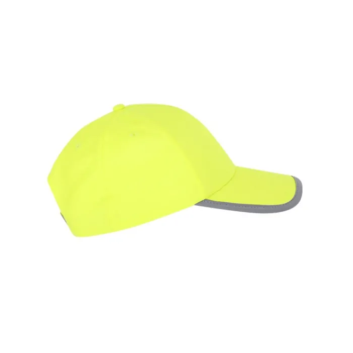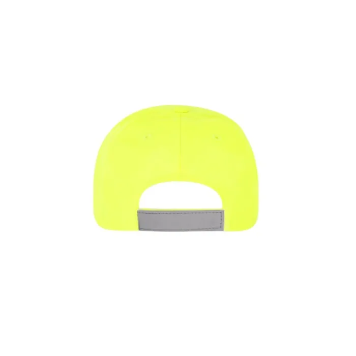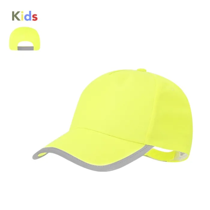 Cappellino sportivo per bambini in morbido poliestere in giallo fluorescente con profilo riflettente sulla visiera e sulla chiusura. Chiusura in velcro e fori di ventilazione ricamati.