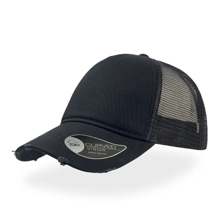 Cappellino morbido con bordo della visiera sfilacciato e rovinato. Pannello frontale in cotone chino con schiuma. Chiusura Snapback in PVC.