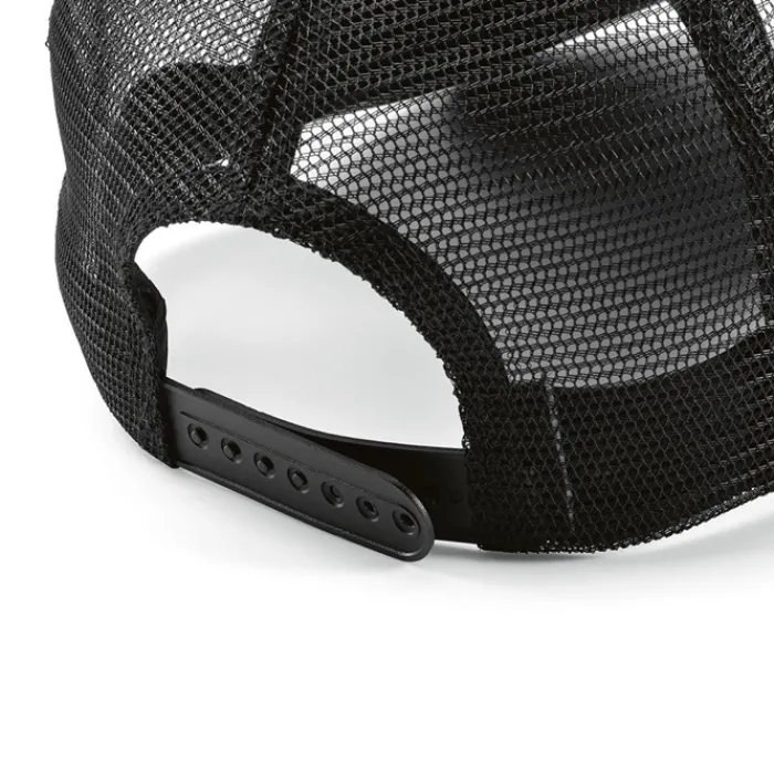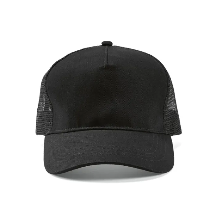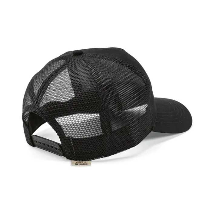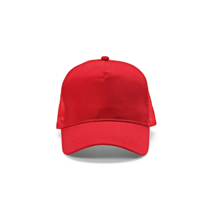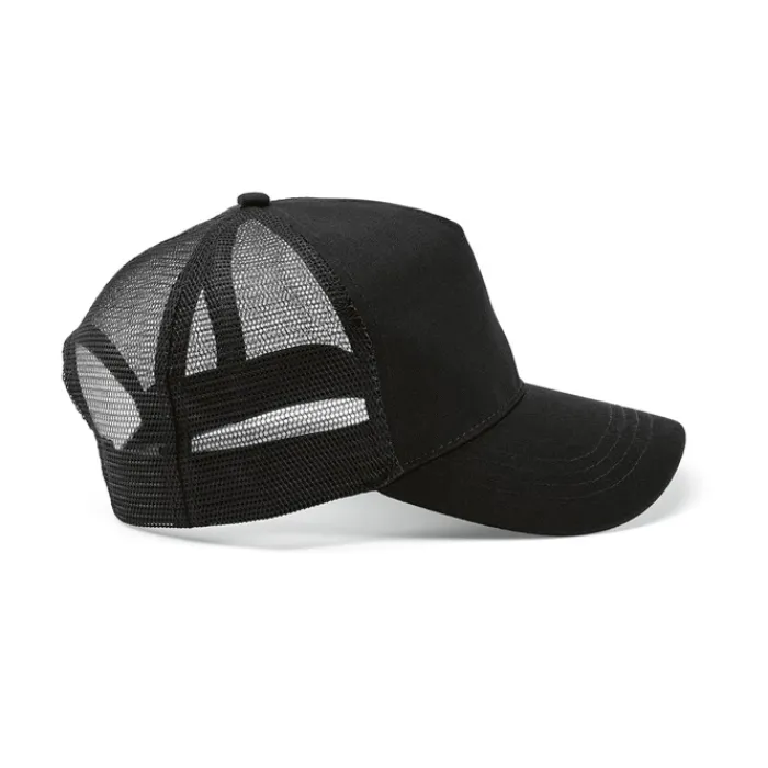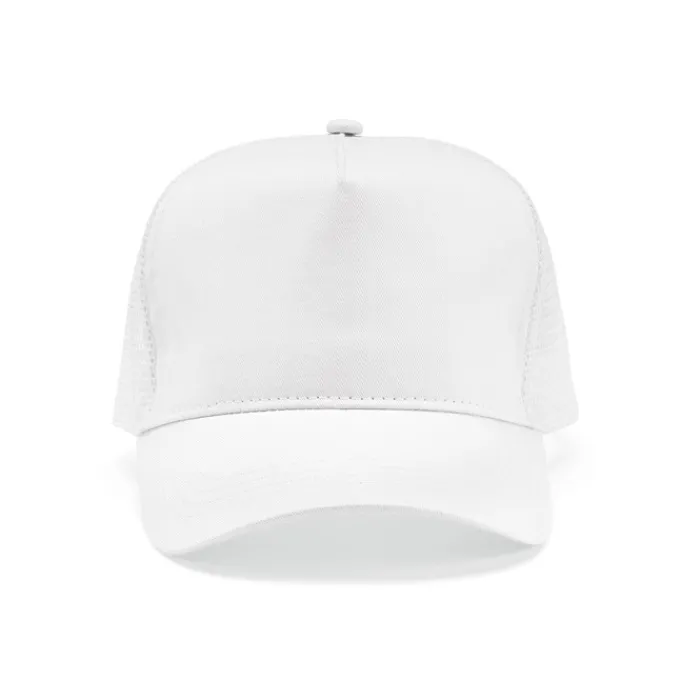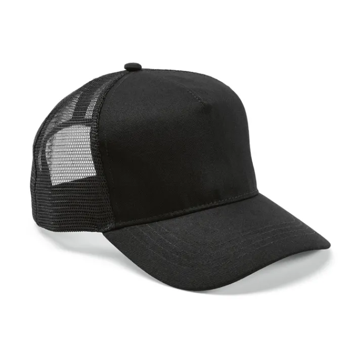 Cappello trucker traspirante 5 pannelli realizzato in cotone riciclato da 220 g/m², con parte posteriore a rete in rPET. Chiusura posteriore regolabile in rPET. Viene fornito in un sacchetto di plastica biodegradabile individuale.