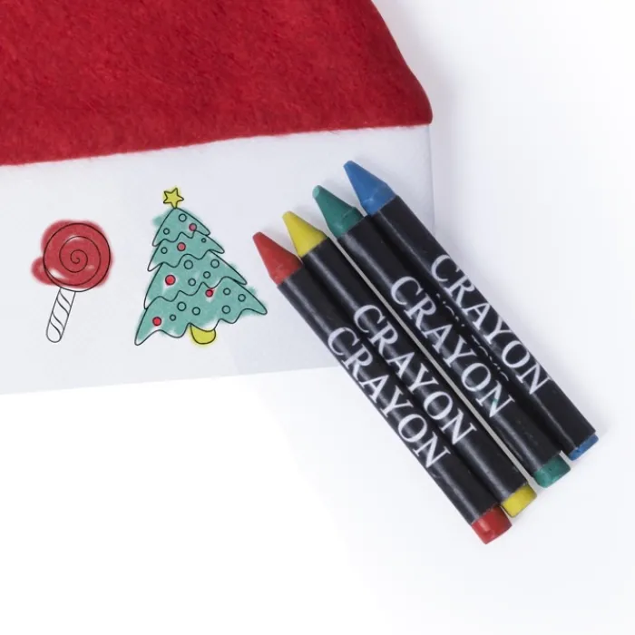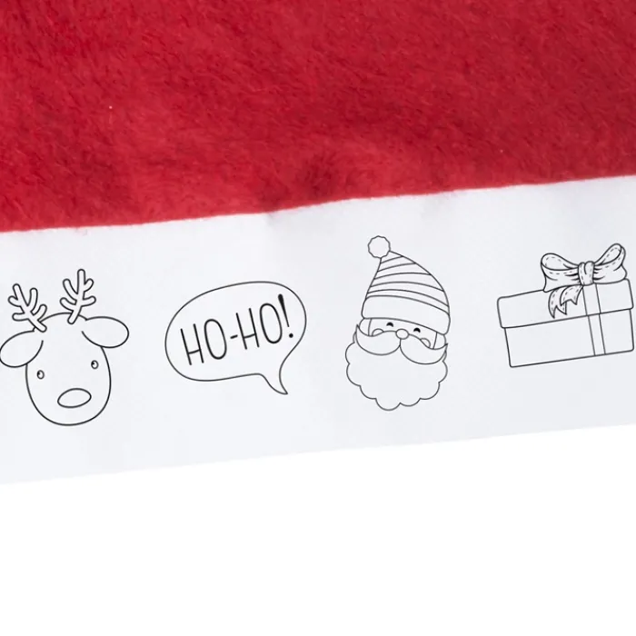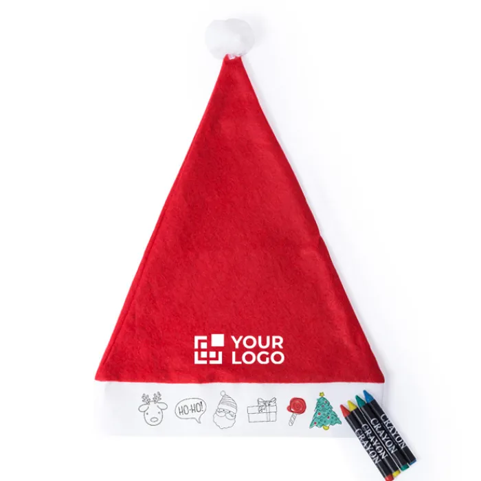 Cappello di Babbo Natale per bambini. La fascia frontale bianca è realizzata in tessuto non tessuto e riporta stampati dei simpatici disegni che potranno essere colorati con i colori a cera che sono inclusi.