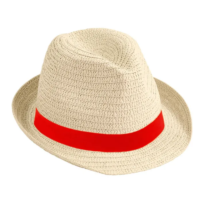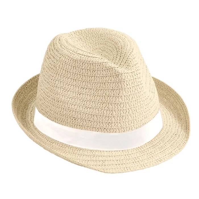 Cappello naturale realizzato in carta paglia a tesa corta e formato unisex con fascia in poliestere. Nel caso in cui ordiniate i cappelli senza stampa, il nastro arriva separato dal cappello.