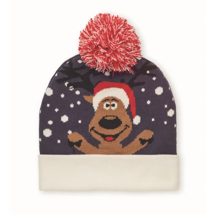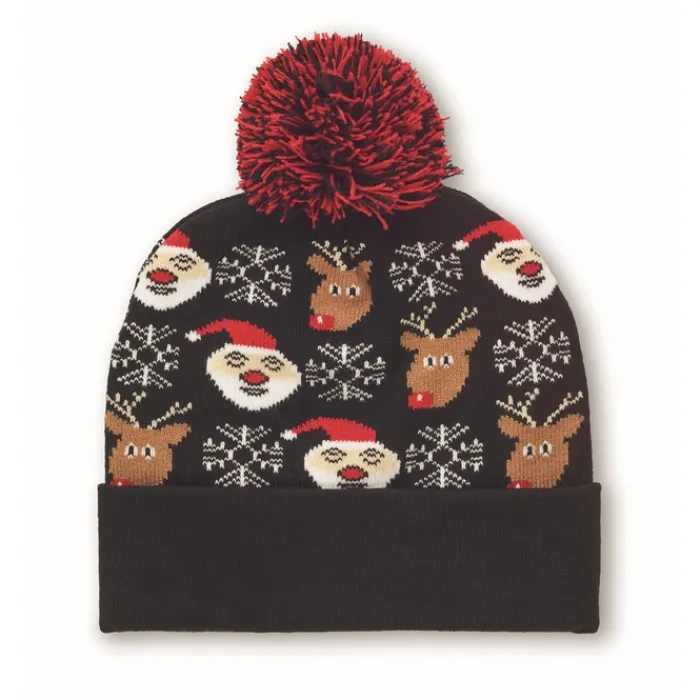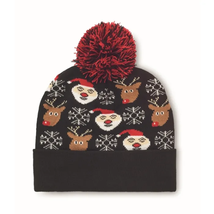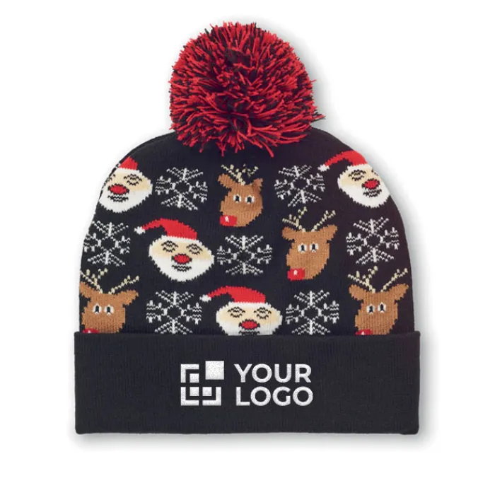 Berretto natalizio lavorato a maglia con risvolto e pompon realizzato in morbido acrilico elasticizzato. Ad ogni colore corrisponde una trama natalizia differente.