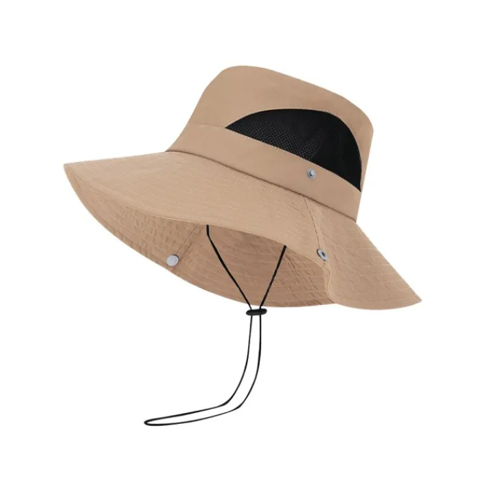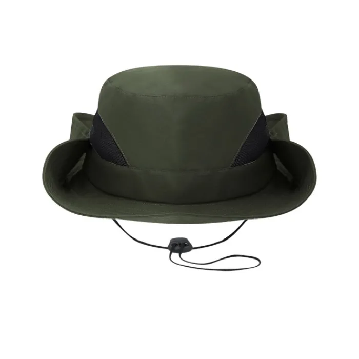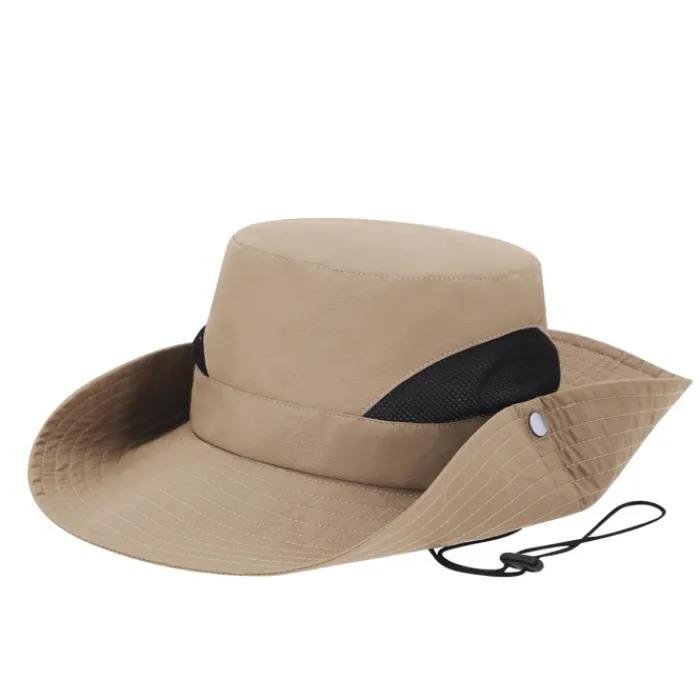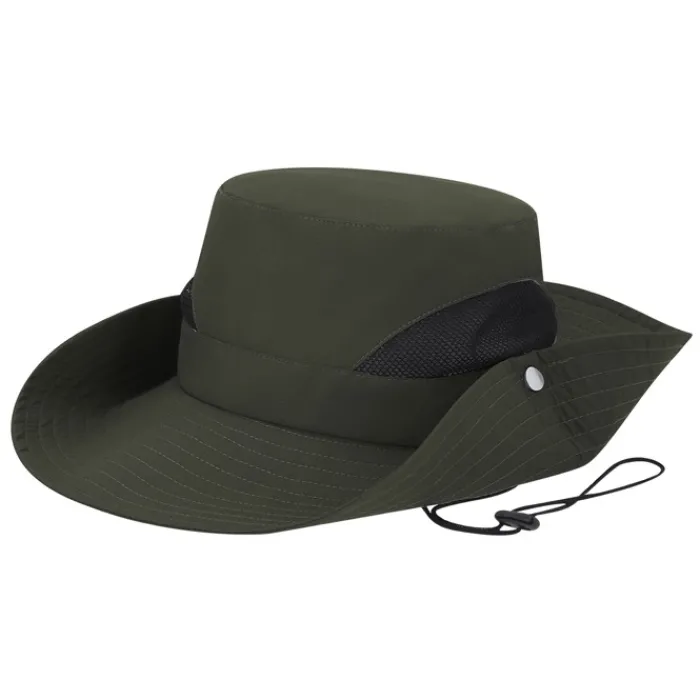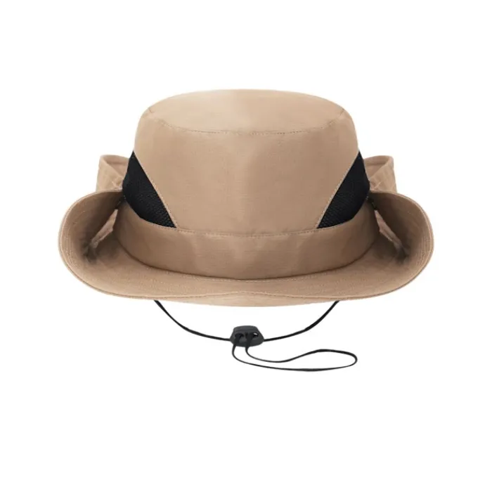 Cappello tipo safari in poliestere resistente, con interno confortevole e fori di ventilazione laterali in tessuto traspirante. Visiera regolabile con chiusure a bottone metallici e cordino di trasporto regolabile.