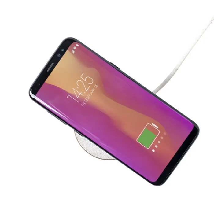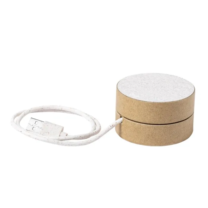 Originale caricatore wireless dalla forma cilindrica. Involucro in cartone riciclato, per contribuire alla conservazione delle foreste e ridurre notevolmente l’impronta di carbonio, con superficie di ricarica e cavo in fibra di grano. Scomparto interno per conservare il cavetto e portarlo ovunque. Indicatore dello stato di carica a LED. Compatibile con smartphone dotati di tecnologia di ricarica wireless. Confezionato singolarmente in un’attraente scatola dal design ecologico, con manuale di istruzioni in inglese e spagnolo.