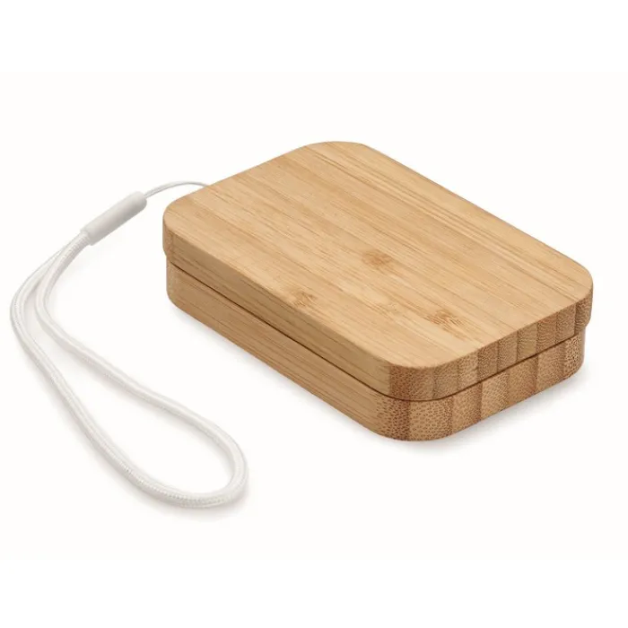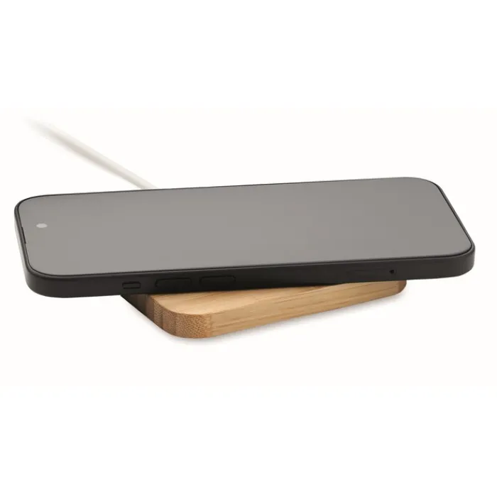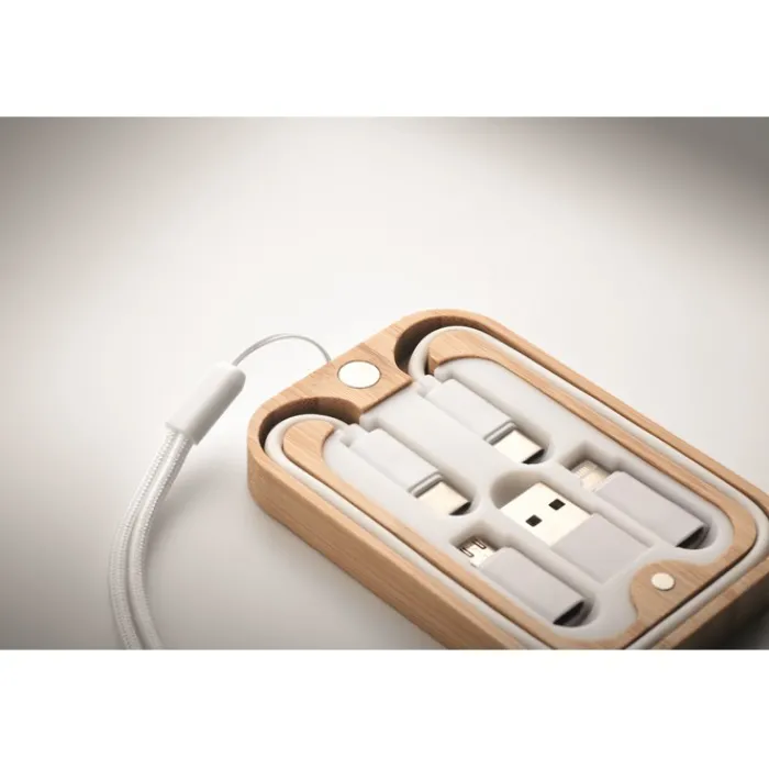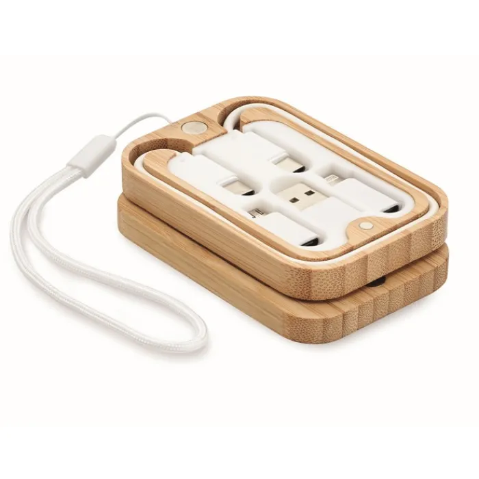 Caricatore wireless da 15W accompagnato da un cavetto di ricarica 3 in 1 con connettori assortiti: Tipo-C a Tipo-C, Tipo-C a USB-A e Tipo-C a micro-B, offrendo versatilità per diversi dispositivi. Presentato in una scatola di bambù con chiusura magnetica e cinturino da polso.