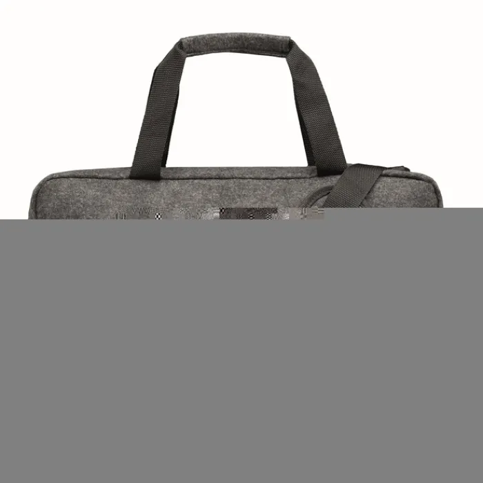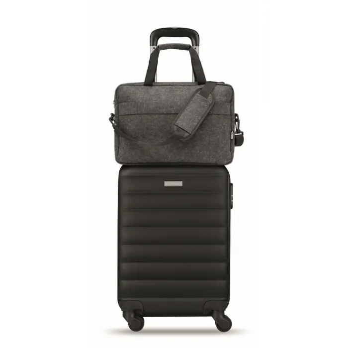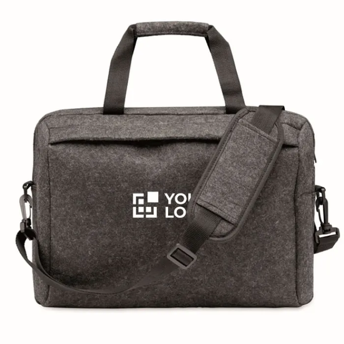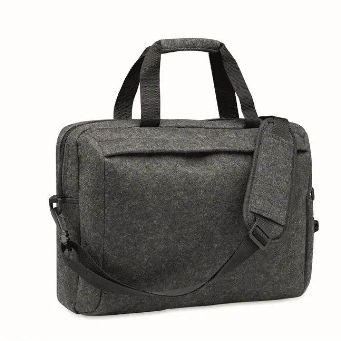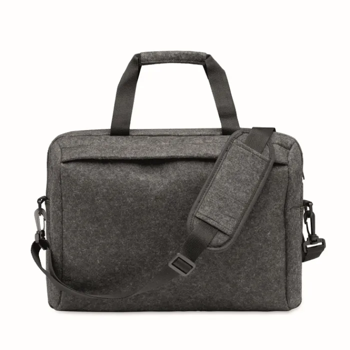 Cartella in feltro RPET con maniglie e tracolla regolabile staccabile. Ha uno scomparto principale con tasca per computer da 15pollici ed una tasca frontale con cerniera. Fascia per agganciarla al trolley sul retro.