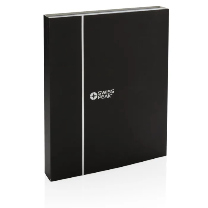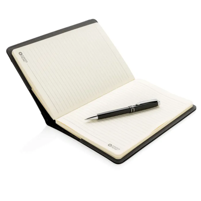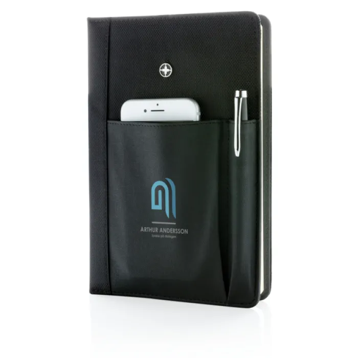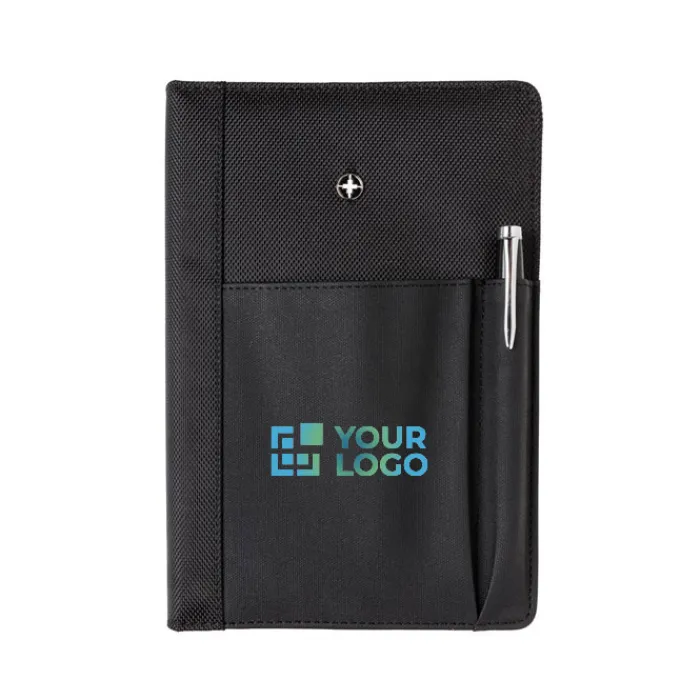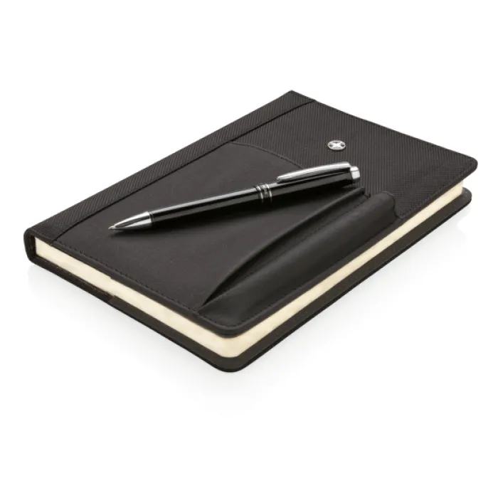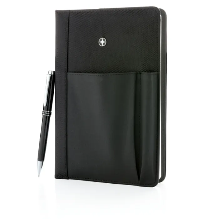 Questo esclusivo set combina eleganza e praticità con una copertina in poliestere 1680D e 600D e un taccuino intercambiabile da 192 pagine di carta 80 g/m2. Il design prevede tasche esterne posizionate strategicamente per penne, carte, denaro e telefono, per tenere sempre organizzati gli oggetti essenziali per il lavoro. La penna ha inchiostro blu e il taccuino formato A5 con pagine a righe rappresenta la combinazione ideale per ogni appunto. Il set viene presentato in una scatola regalo. Trovi tutte le opzioni di personalizzazione nella sezione Dettagli di stampa.
