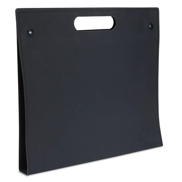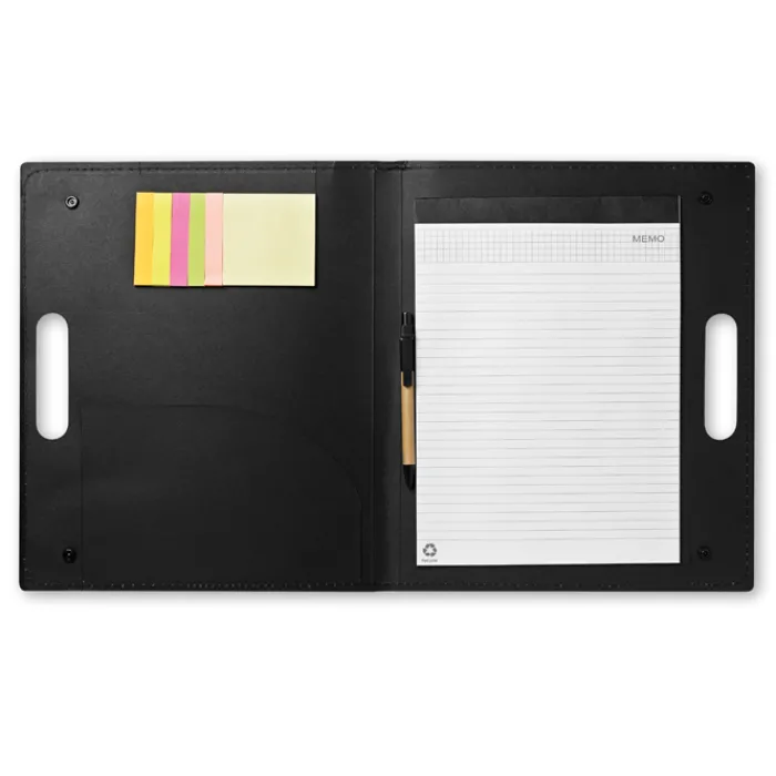 Cartella con block notes (20 fogli a righe inclusi) in cartone, chiusura con 2 bottoni a pressione, penna a sfera con refill blu e meccanismo a scatto, 5 segna pagina colorati e post-it.