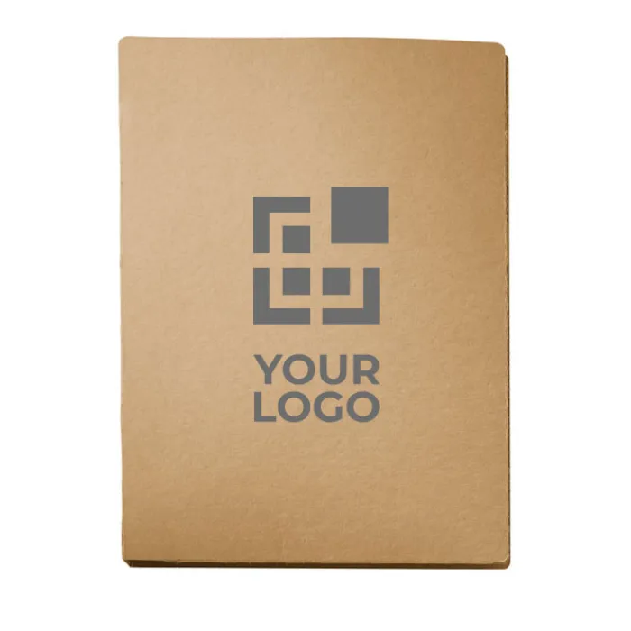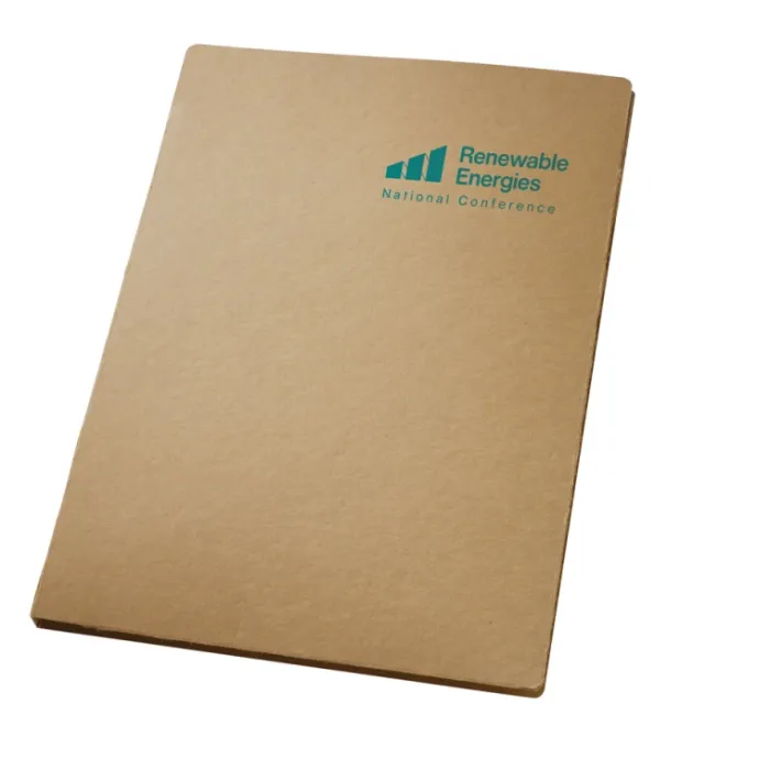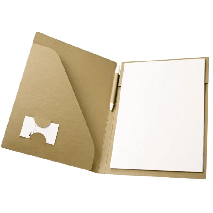 Cartellina formato A4 realizzata in carta: 450 g/m². Al suo interno contiene un blocco con 20 fogli bianchi di carta riciclata. Include una penna a sfera. Viene consegnato smontato separatamente: dovrete inserire voi il block notes e la penna all’interno di ciascuna cartellina.
