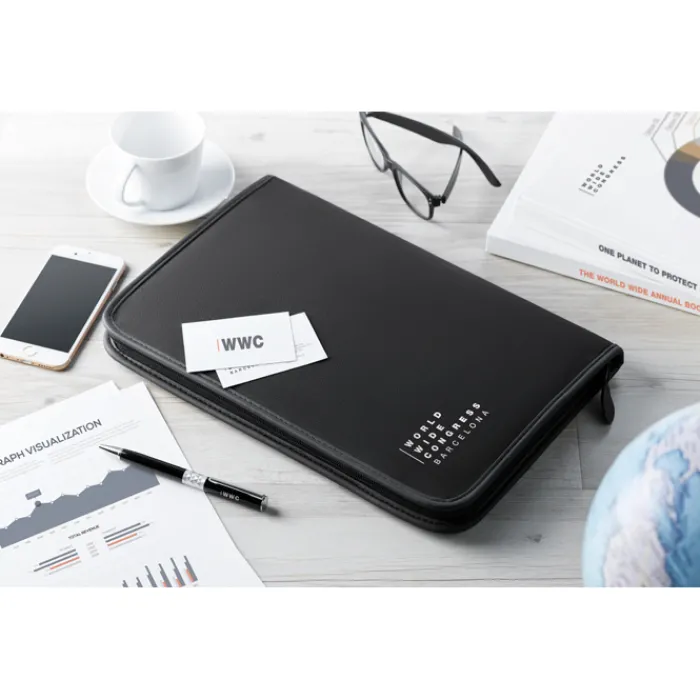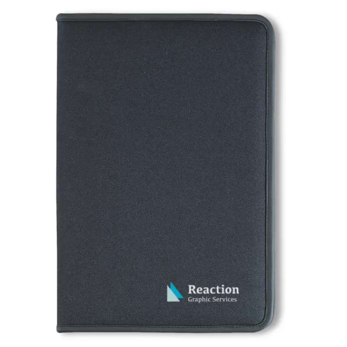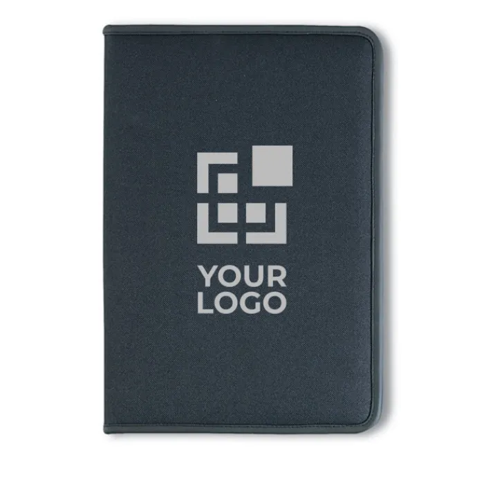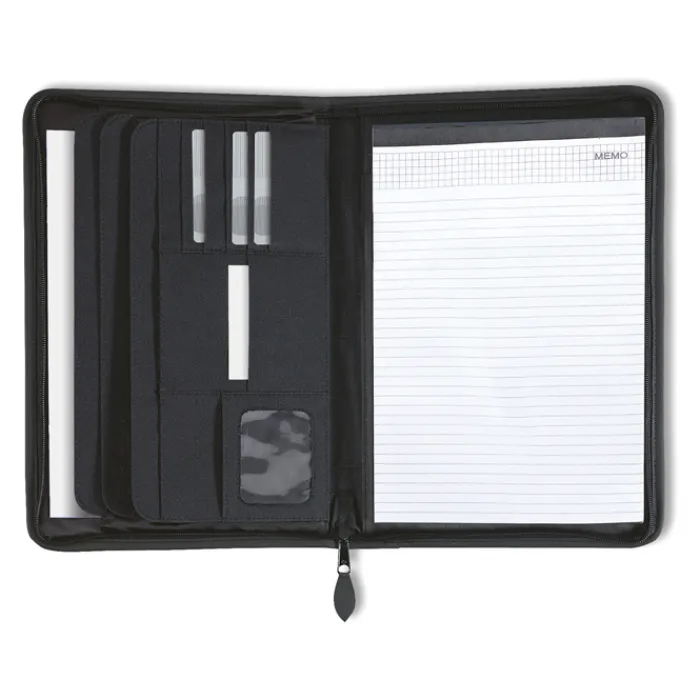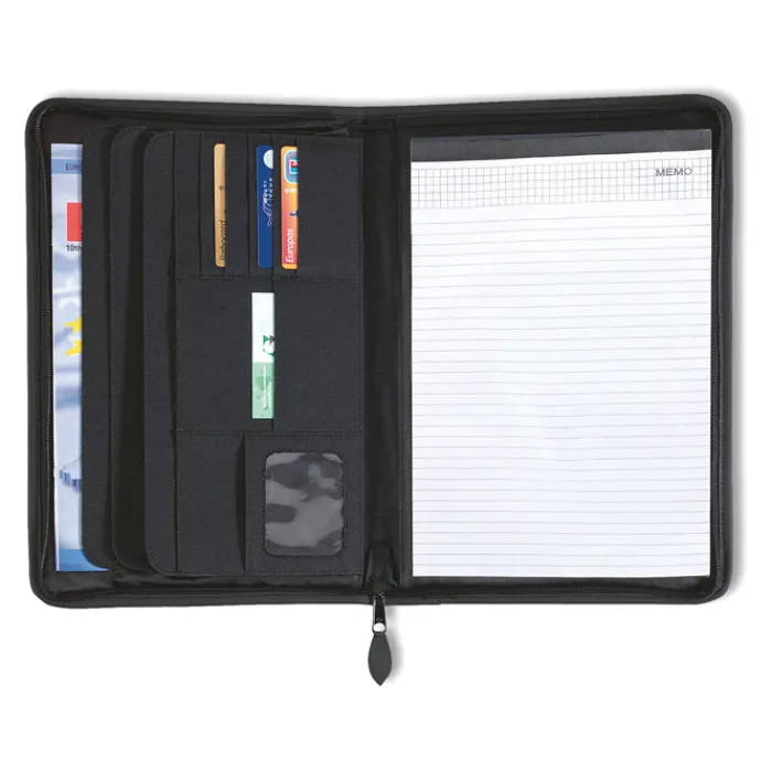 Porta blocnotes A4 con chiusura a zip, 4 scomparti e porta biglietti da visita, blocnotes 20 fogli neutri. In poliestere 600D e 210T.