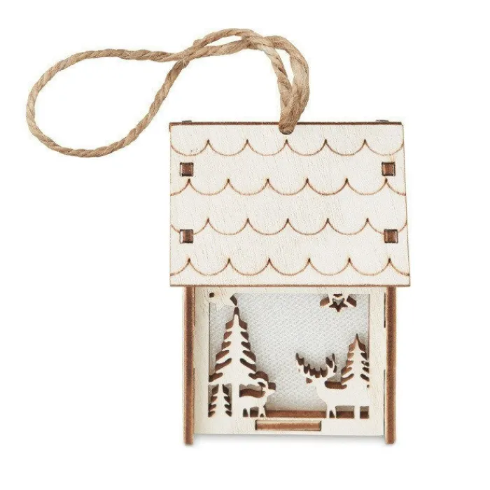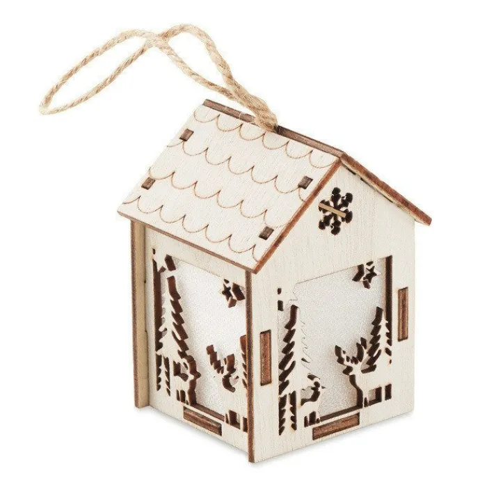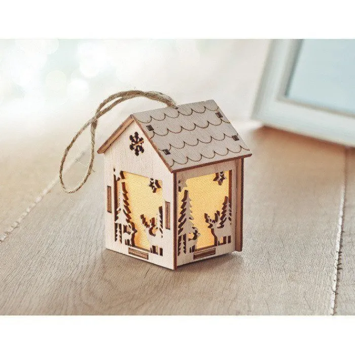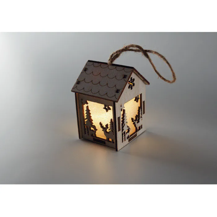 Casetta in MDF con luce interna e motivi natalizi. 3 batterie AG10 incluse.
